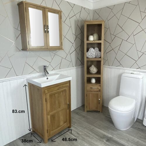 Slimline Bathroom Cabinet Vanity Unit | Solid Oak Furniture | Ceramic Sink Tap Plug 308CBC