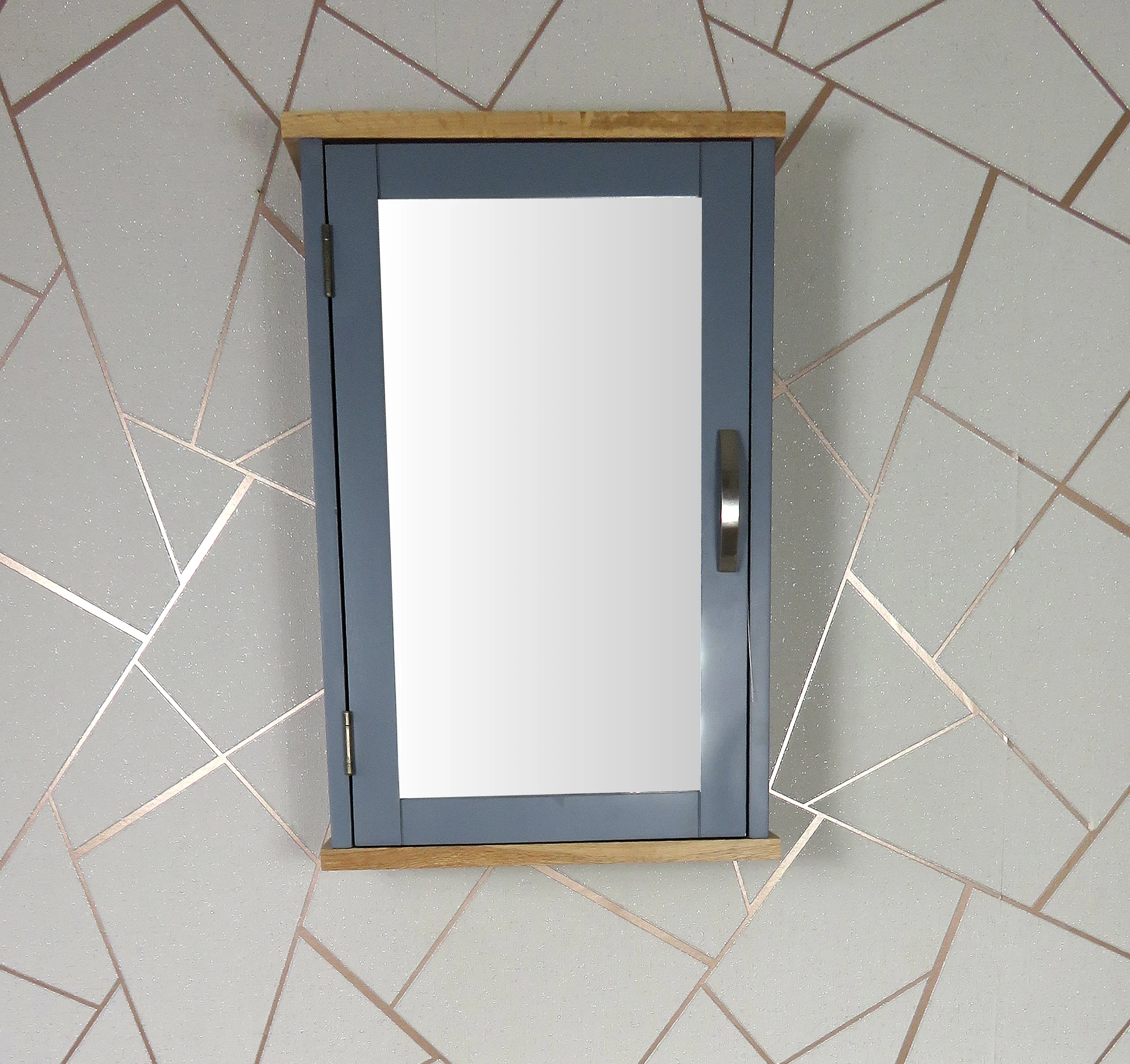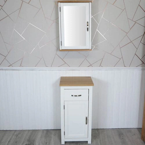 This truly beautiful contemporary slender wall mounted bathroom cupboard is constructed from 100% solid oak hard wood. It features single mirror door and one internal central shelf which is removable. This unit would complement our matching bathroom vanity units perfectly.