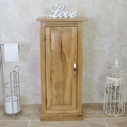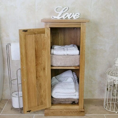 Solid oak top white bathroom furniture storage unit (499P) is proper useful. The open cubby spaces are great for baskets and the drawer’s bigger than I thought.