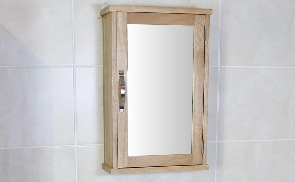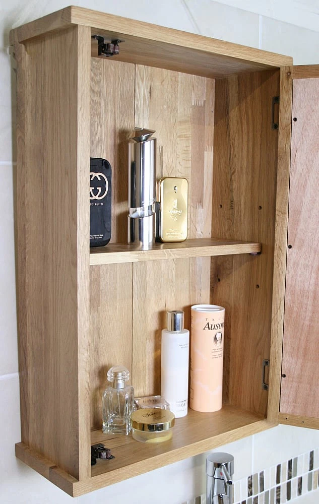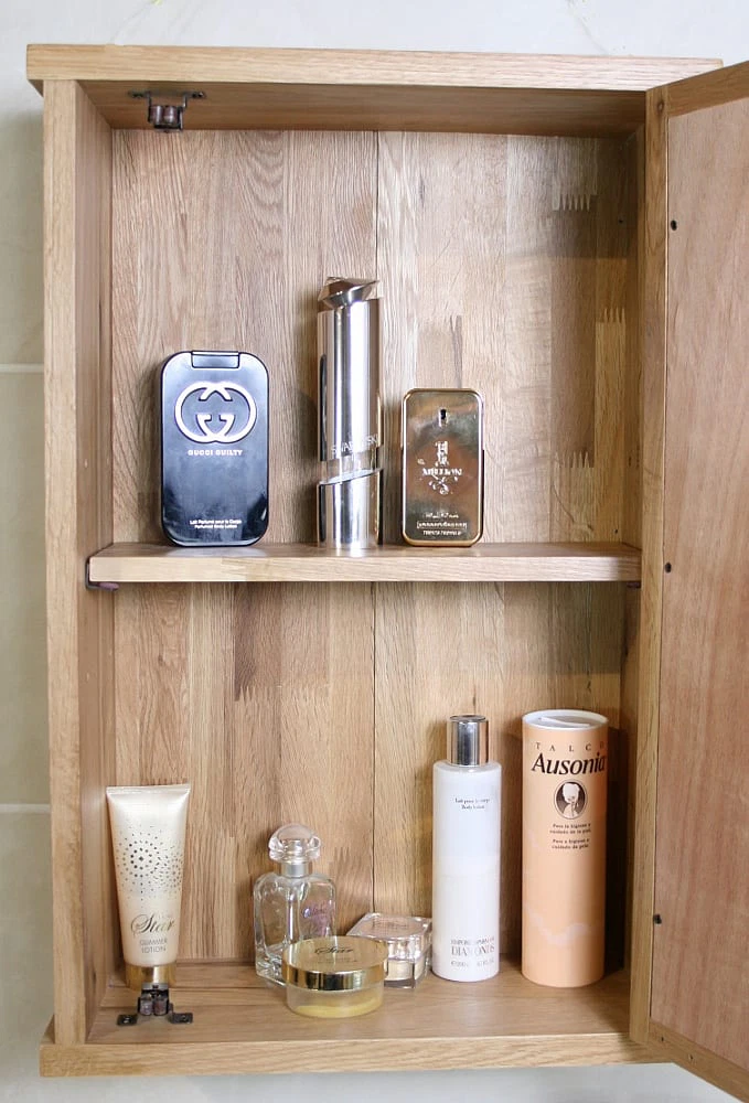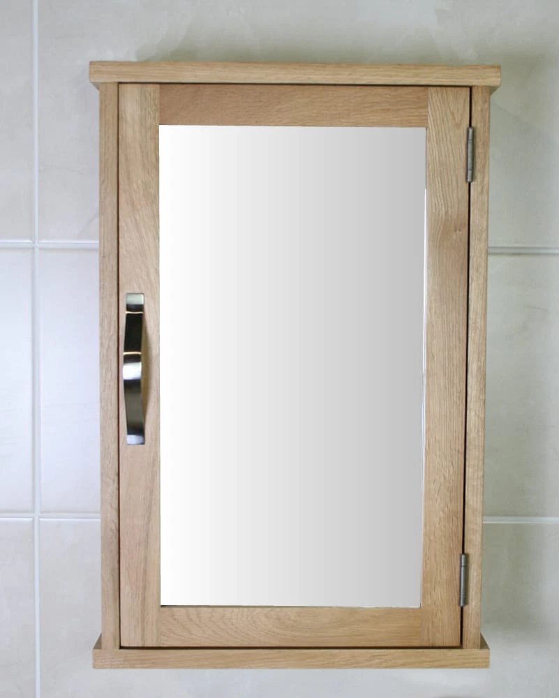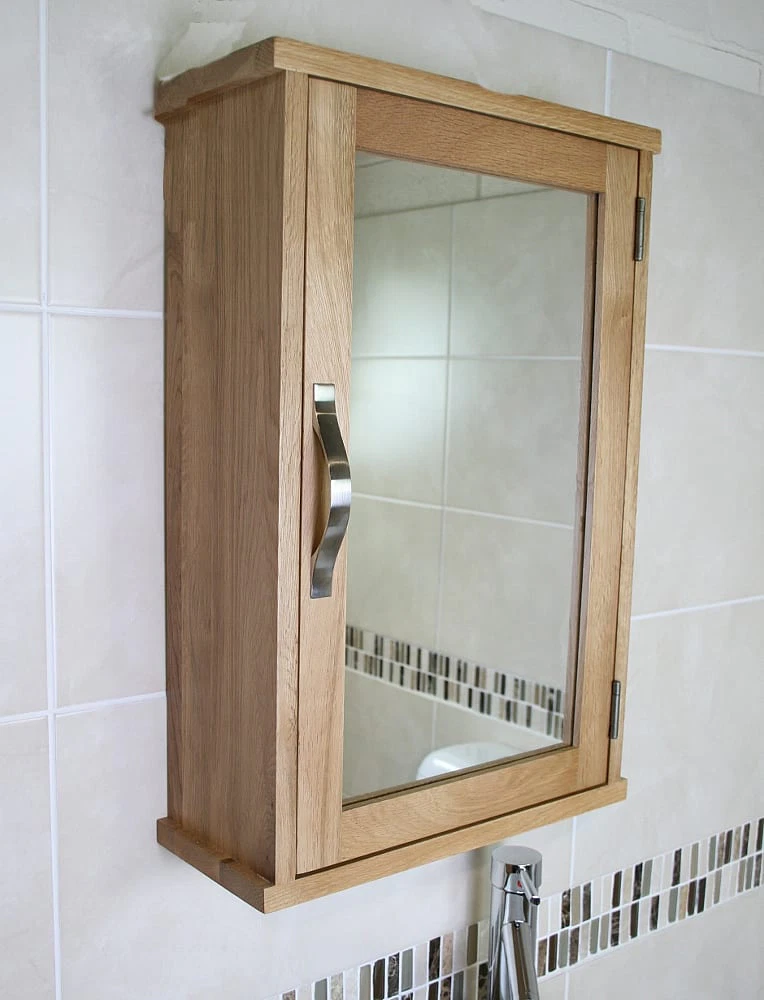 This truly beautiful contemporary slender wall mounted bathroom cupboard is constructed from 100% solid oak hard wood. It features single mirror door and one internal central shelf which is removable. This unit would complement our matching bathroom vanity units perfectly.
