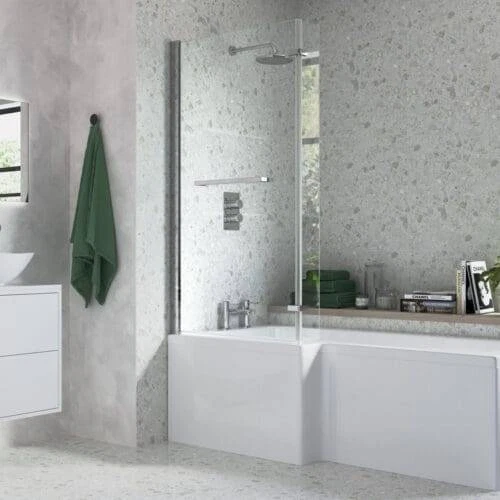The J shape works really well in our smaller bathroom. Gives extra shower space without taking over the room. Good solid feel.