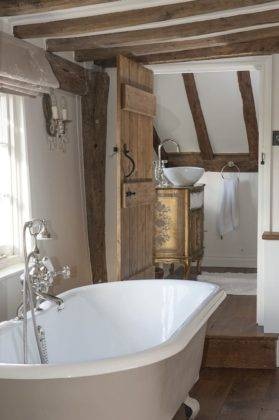 By being smart about the space in your bathroom then leads to creative additions to the area, such as the DIY shelves seen above. Displaying your products can help to give your bathroom a certain style & allow you to show off your favourite ornamental pieces and bathroom favours. Below, this charming country bathroom showcases so many aspects which we love! The beams and exaggeration of wooden features is gorgeous & inviting. The charming farm house style door which then leads to a step down into the bathing area adds those special homely touches whig make this property, and it’s bathroom, stand out.