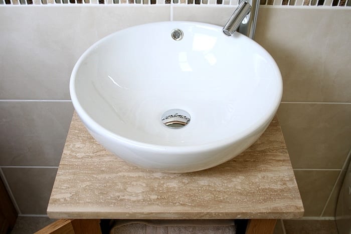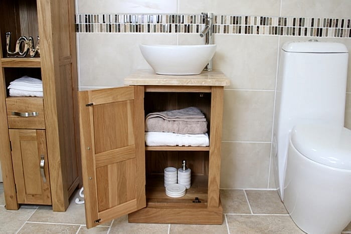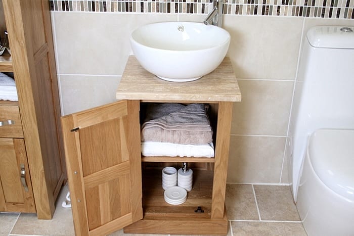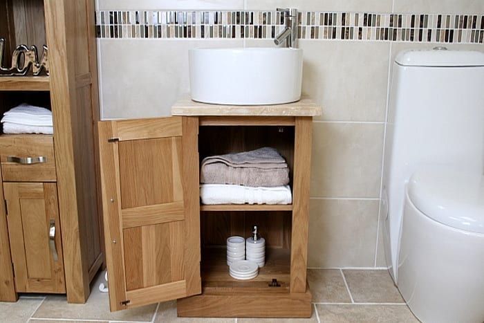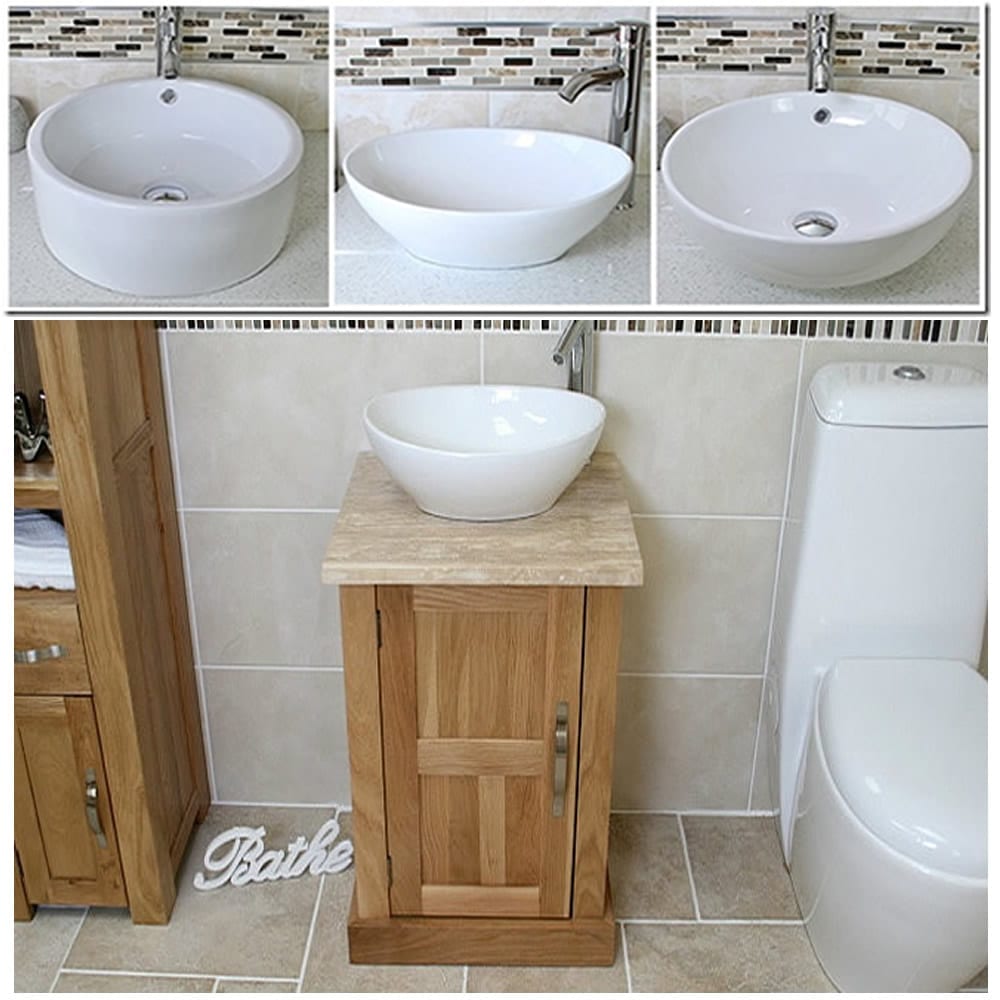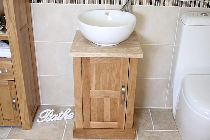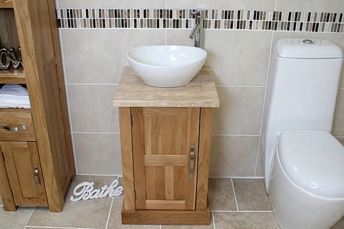 Free-Standing Compact Oak Vanity Unit with Travertine Top & Ceramic Basin