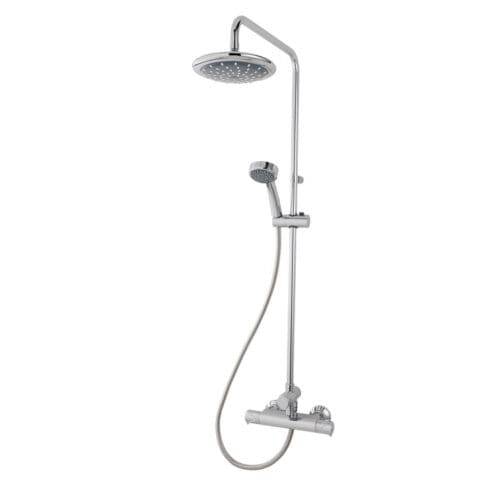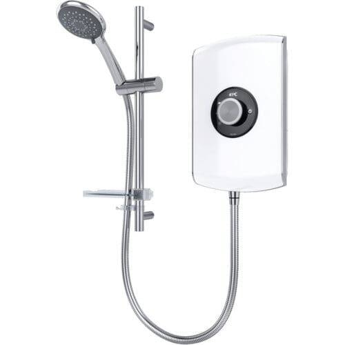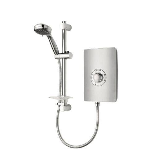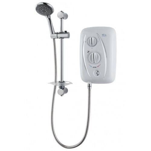 Stabilised electric shower with 2 Year Guarantee. Push button power controls and temperature control knob with 5 spray patterns by Triton