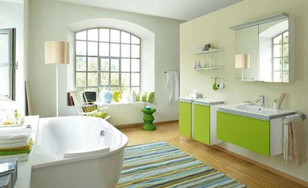 This look is all about injecting colour and comfort which will brighten up your mood on a gloomy, rainy day. Add an armchair, cushions, your favourite books, vases, and a stylish rug to create a perfect chill-out bathroom. Rather than choosing all-white, add coloured cabinets for a subtle yet effective splash of colour, bringing the outside in, and adding instant warm vibes to your bathroom.