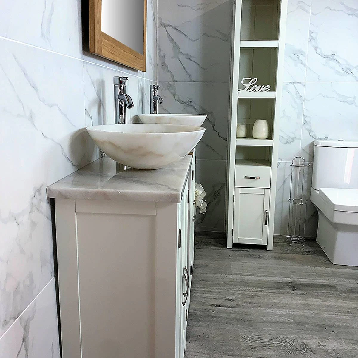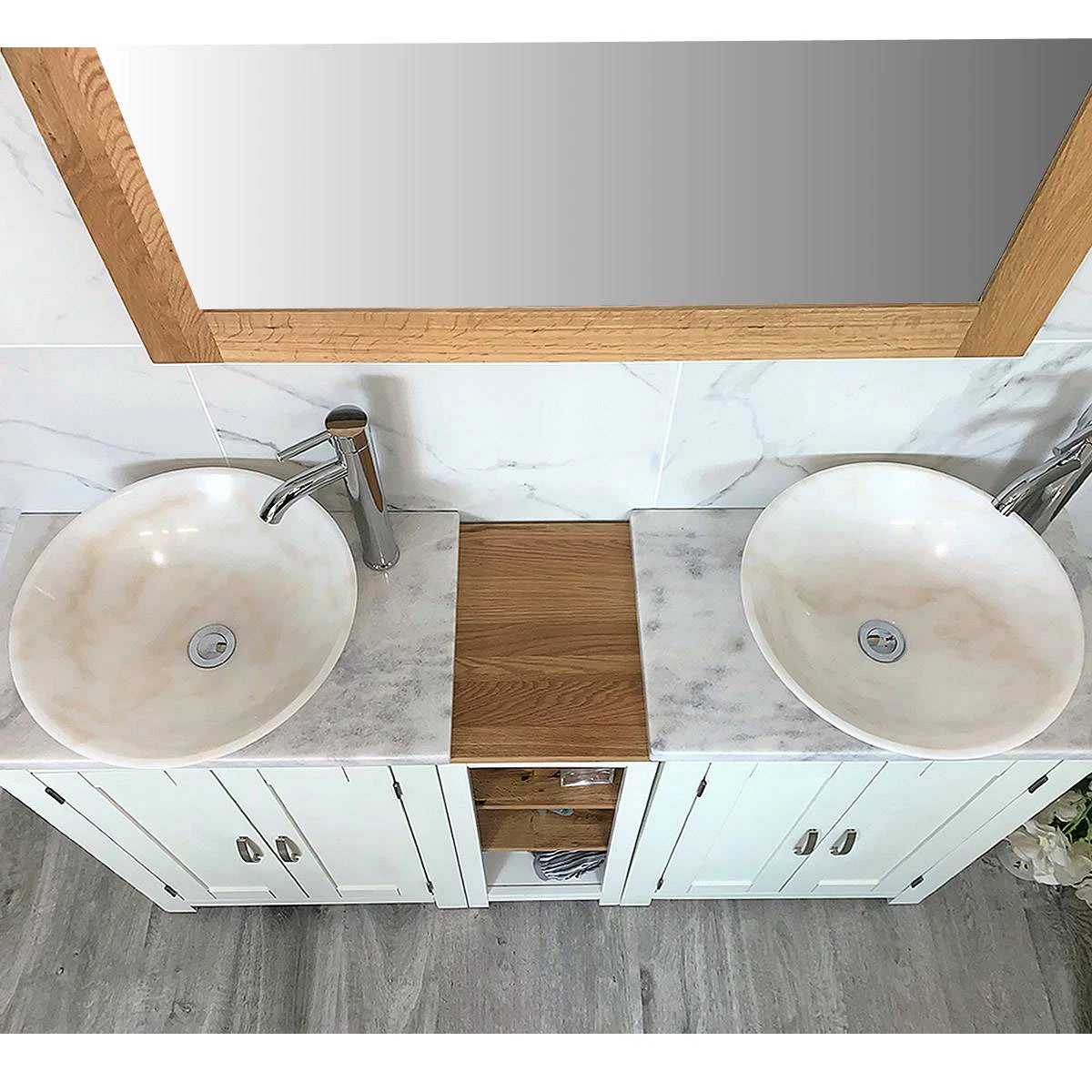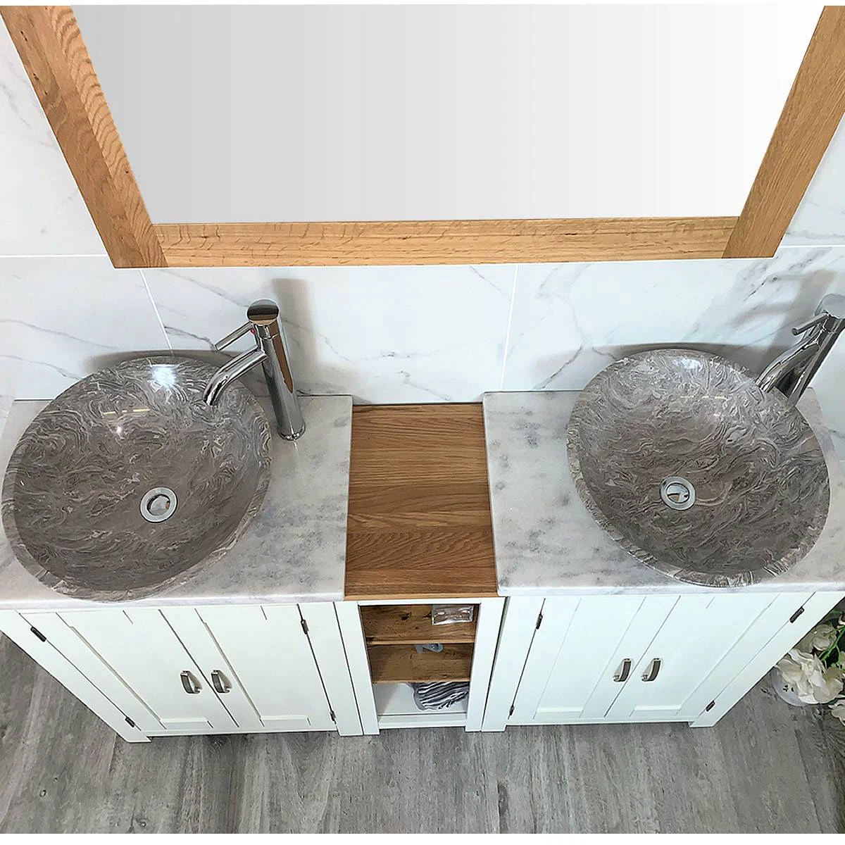 - Two round curved marble bowls of choice, see the dimensions of each basin below: