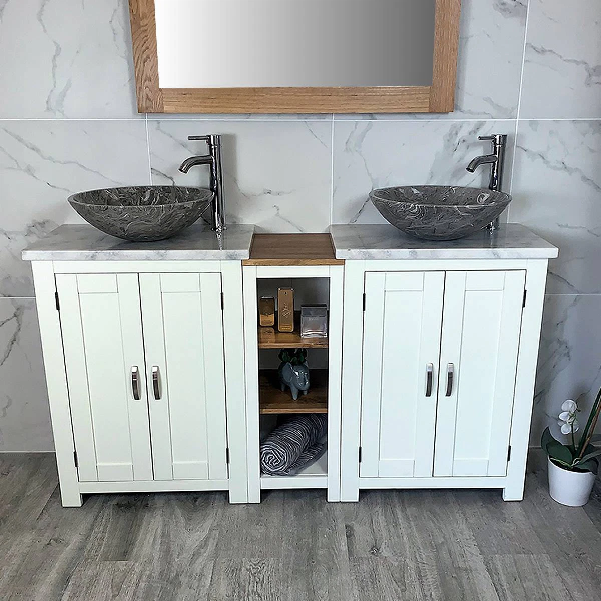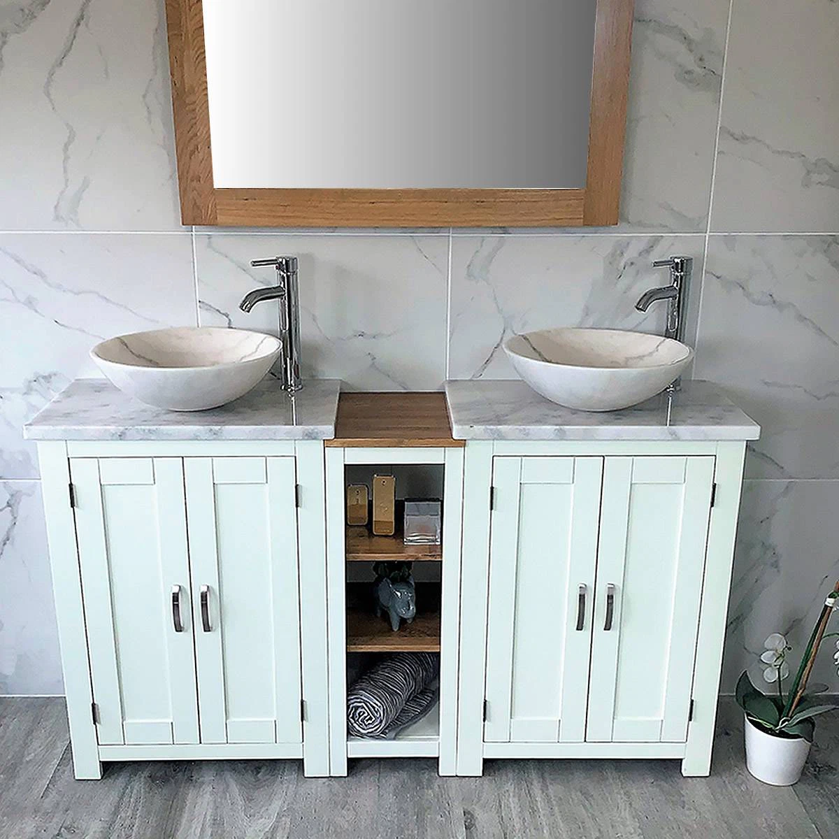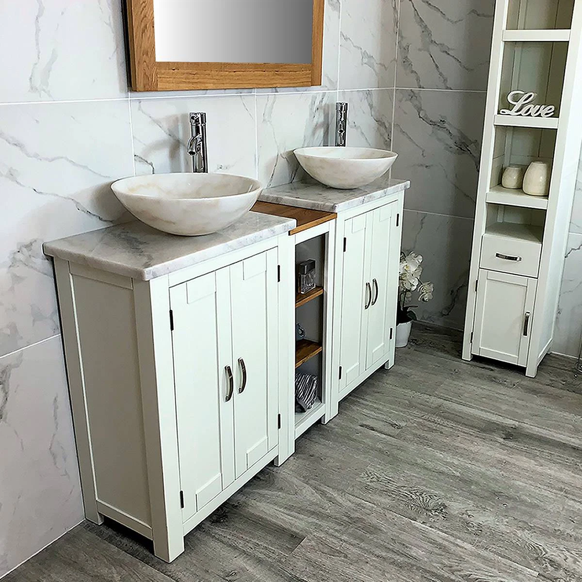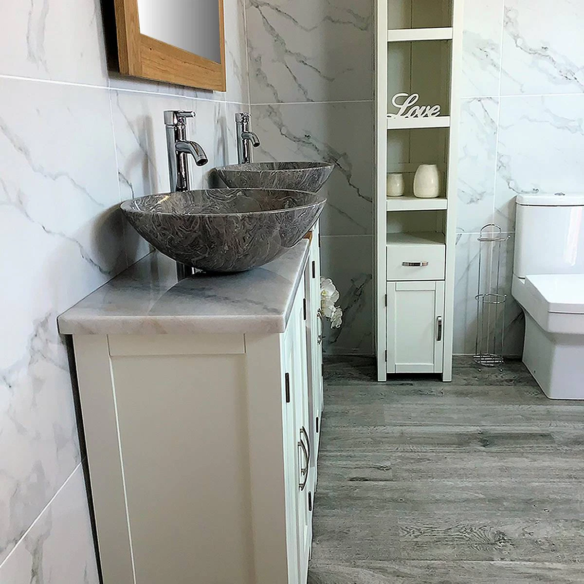 - Two round curved marble bowls of choice, see the dimensions of each basin below: