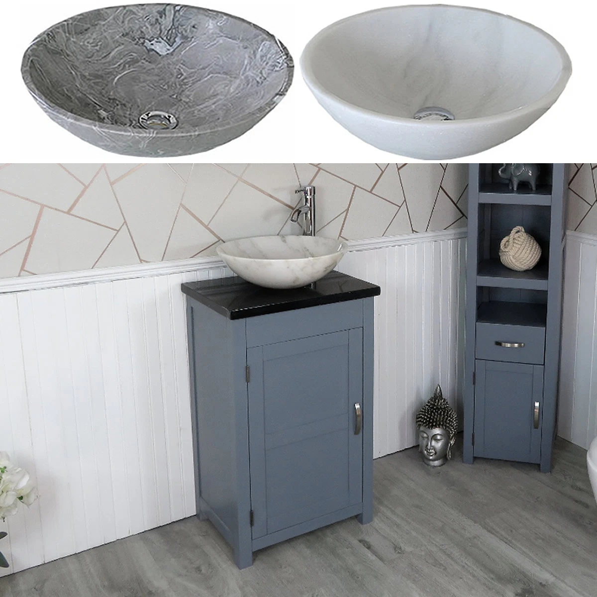 - A beautiful heavy marble bowl of choice, see the dimensions of each basin below: