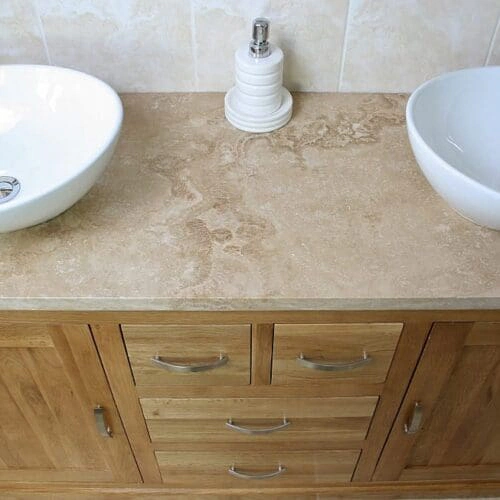 - One stunning double pre-drilled cream veined marble work top.