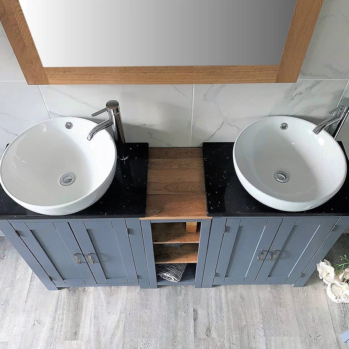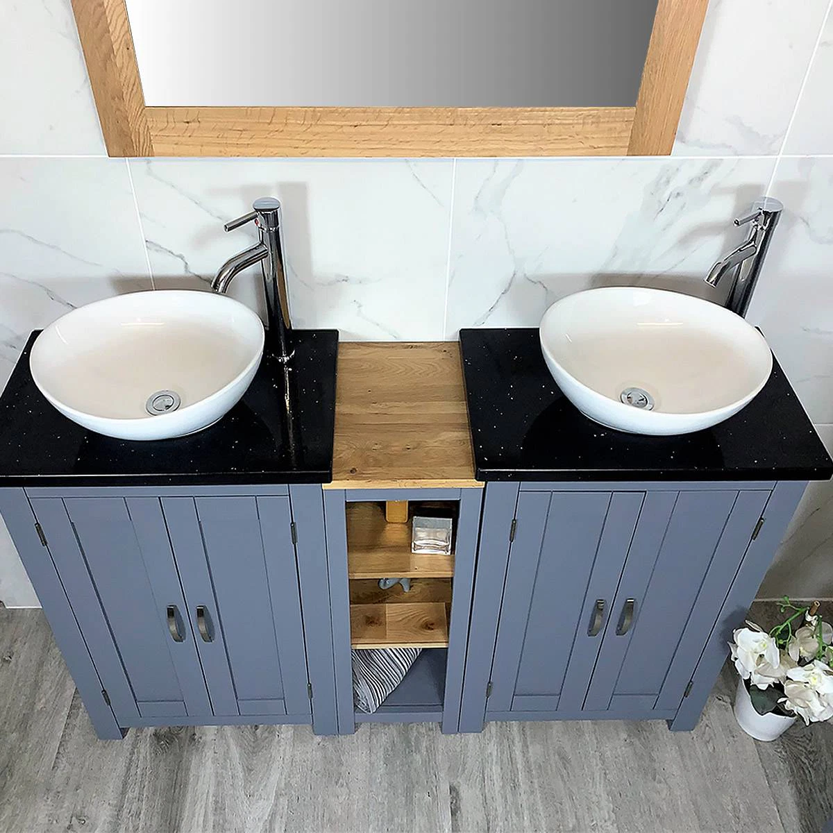 - Two stunning double pre-drilled black quartz work tops.
