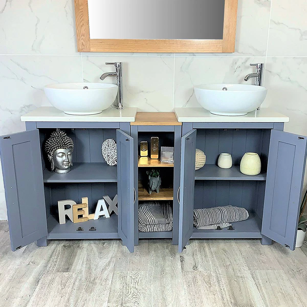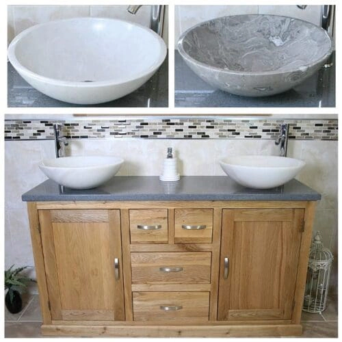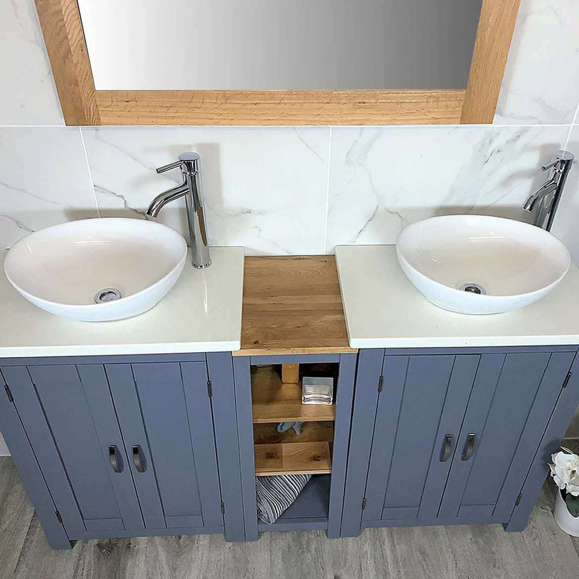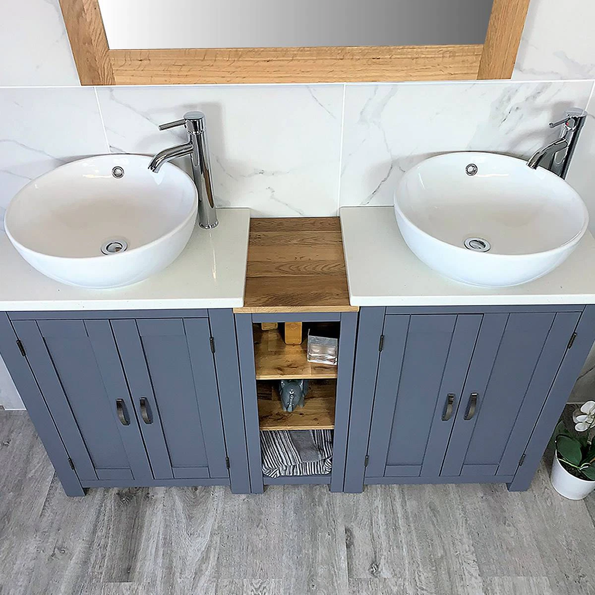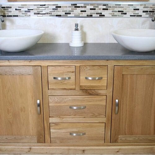 Double White Ceramic Basin, Large Oak Vanity Unit with White Quartz Top Finish