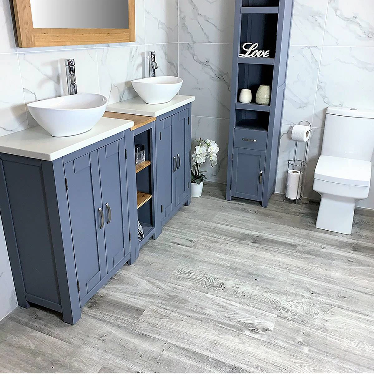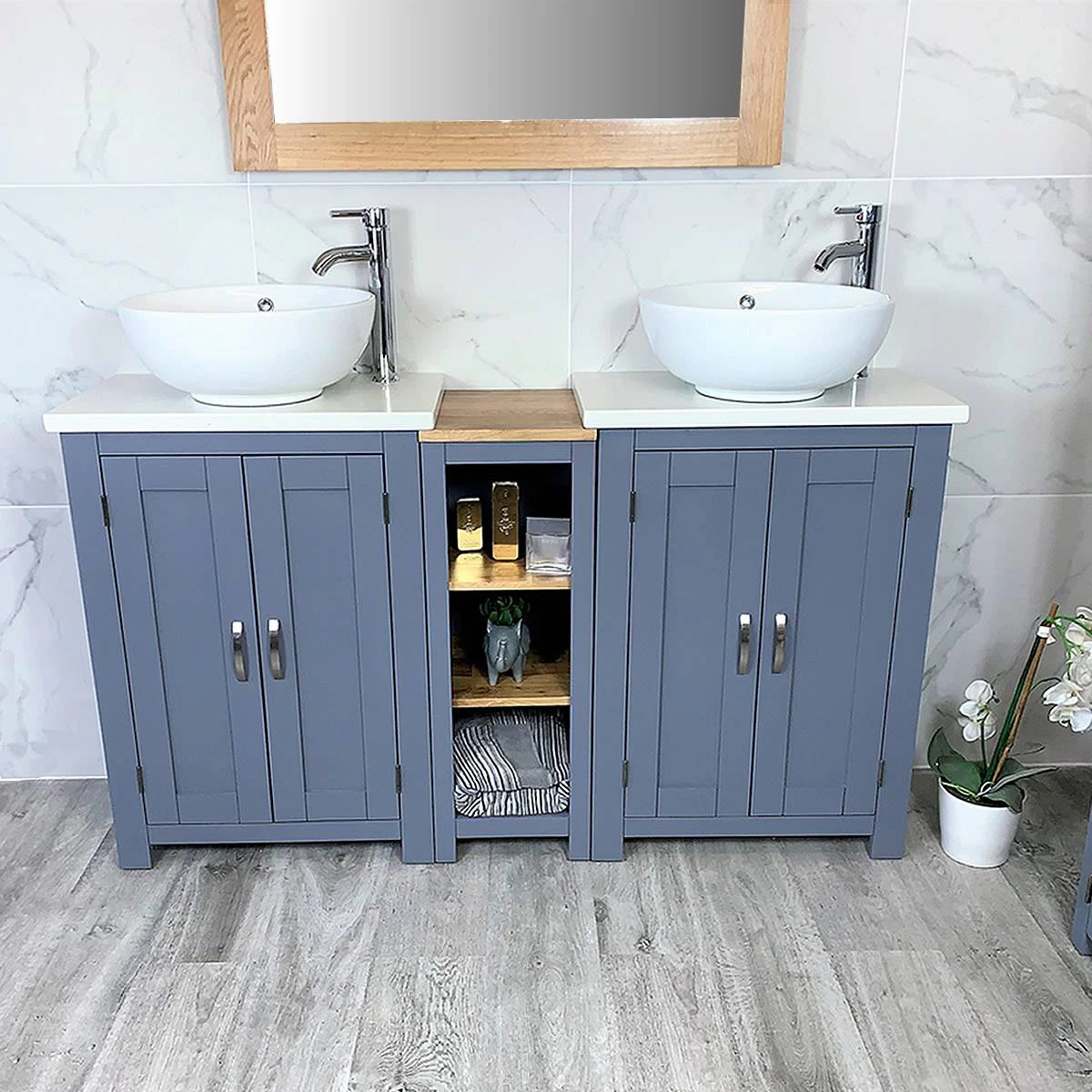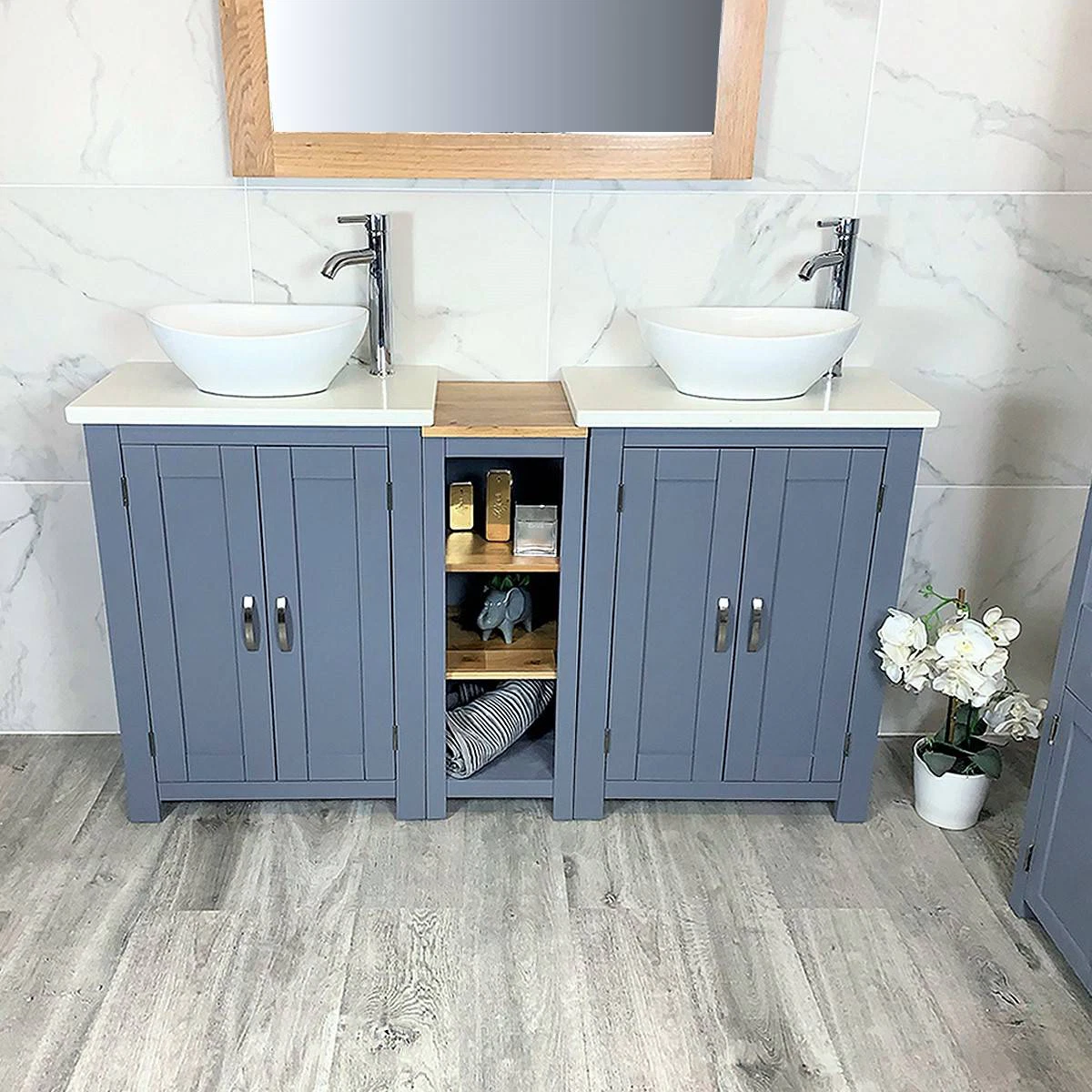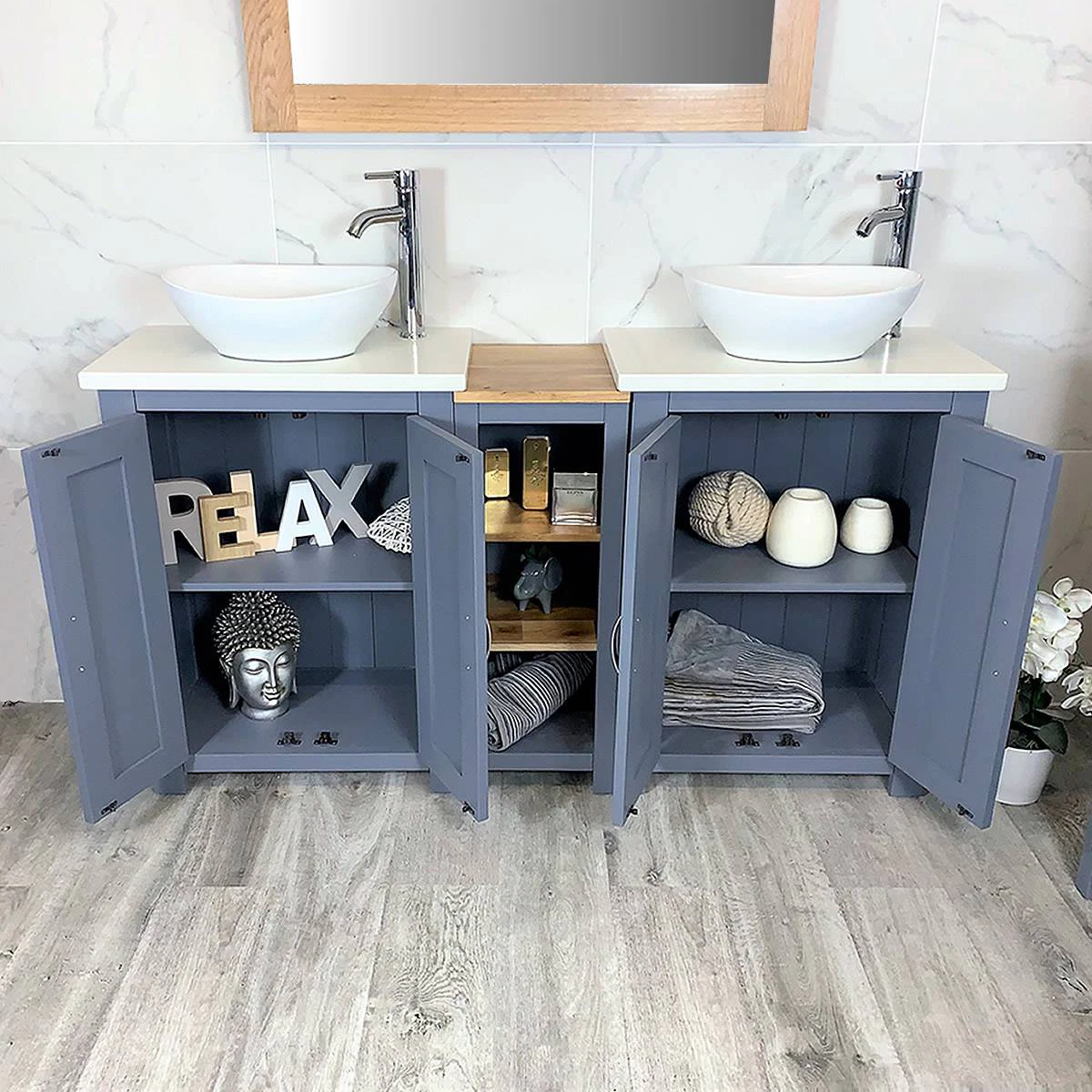 Double White Ceramic Basin, Large Oak Vanity Unit with White Quartz Top Finish