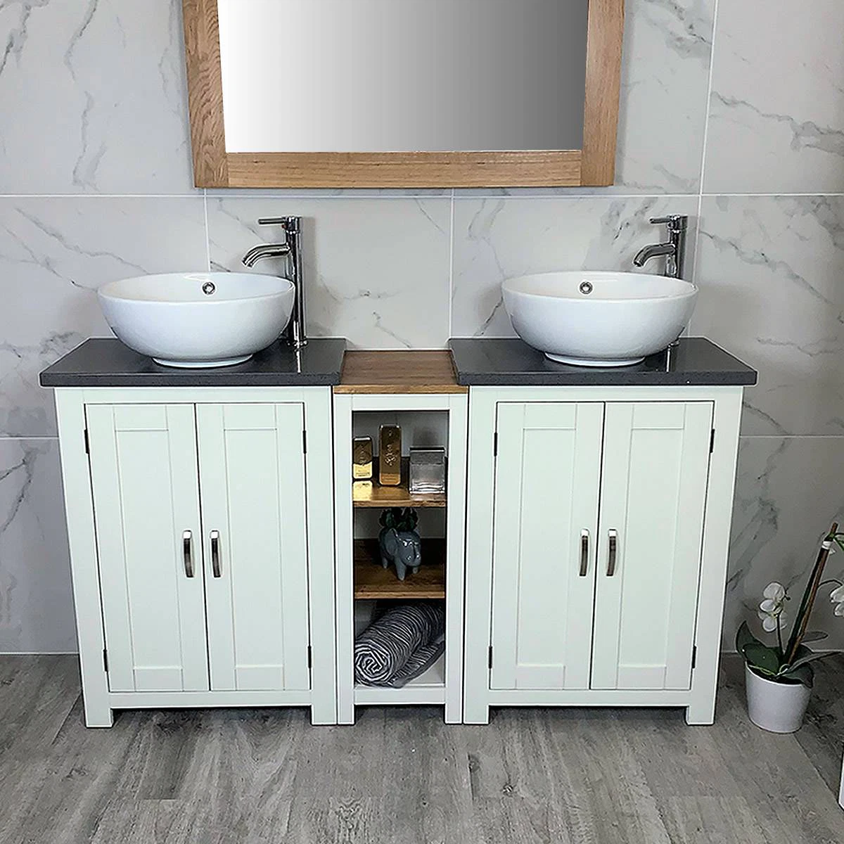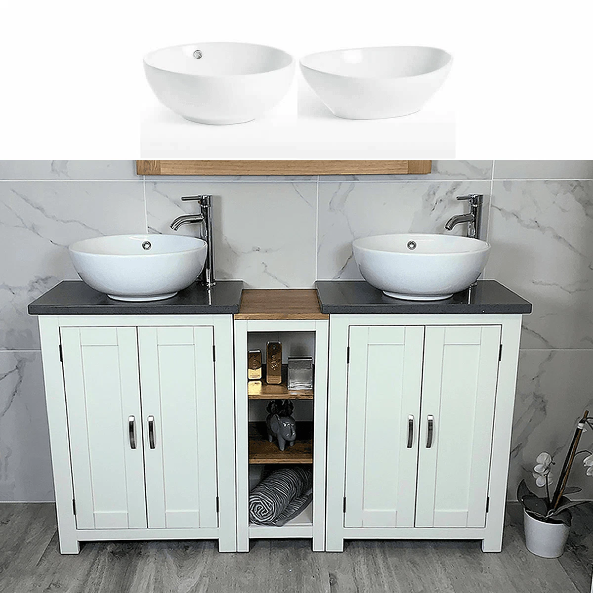 - Two ceramic bowls of choice, see the dimensions of each basin below: