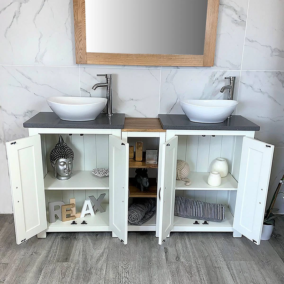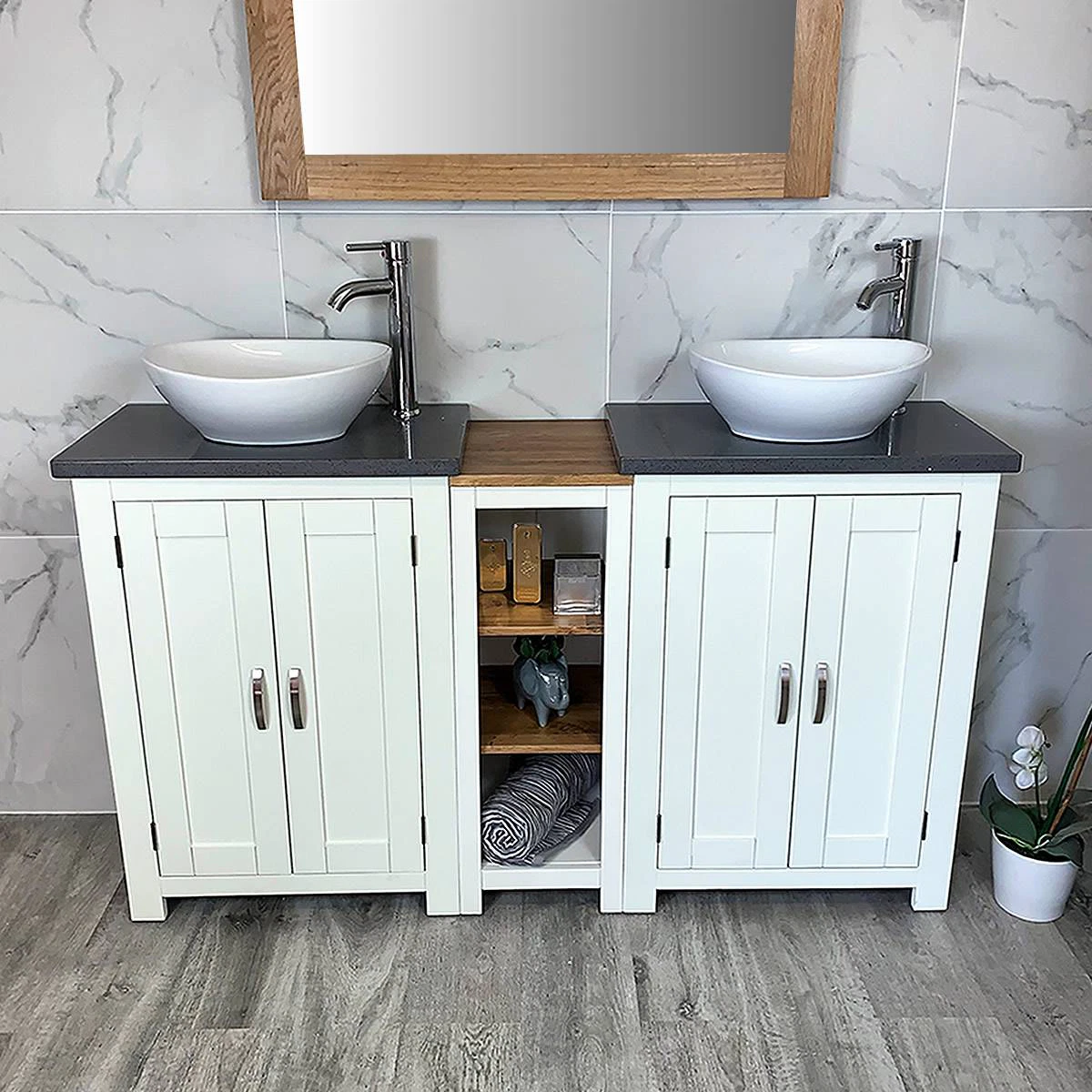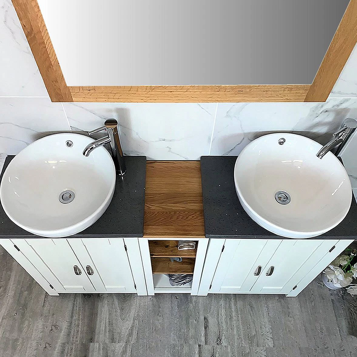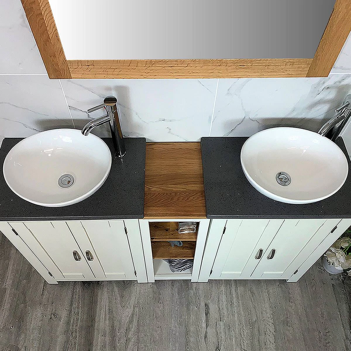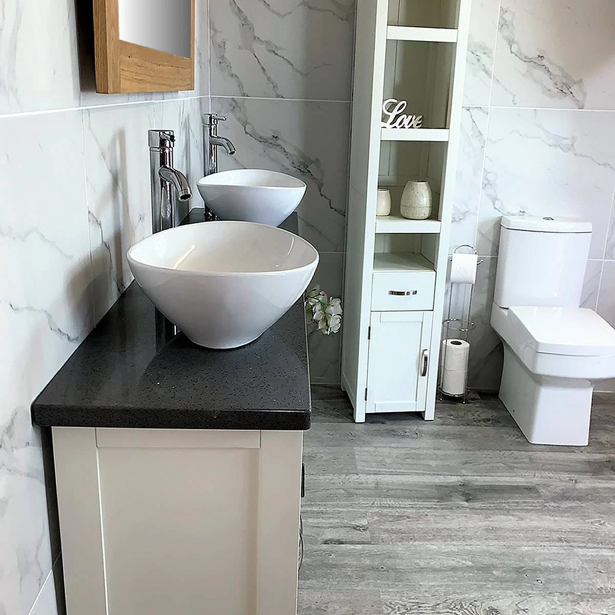 - Two stunning double pre-drilled grey quartz work top.