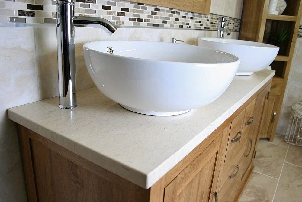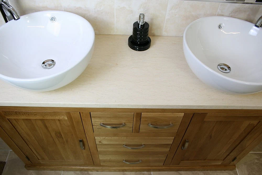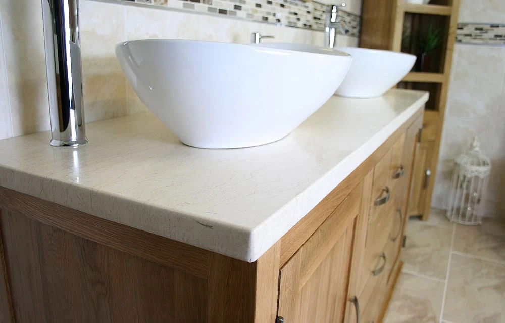 - One stunning double pre-drilled cream marble work top.