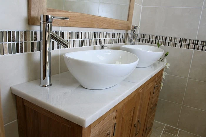 - One stunning double pre-drilled white marble work top.
