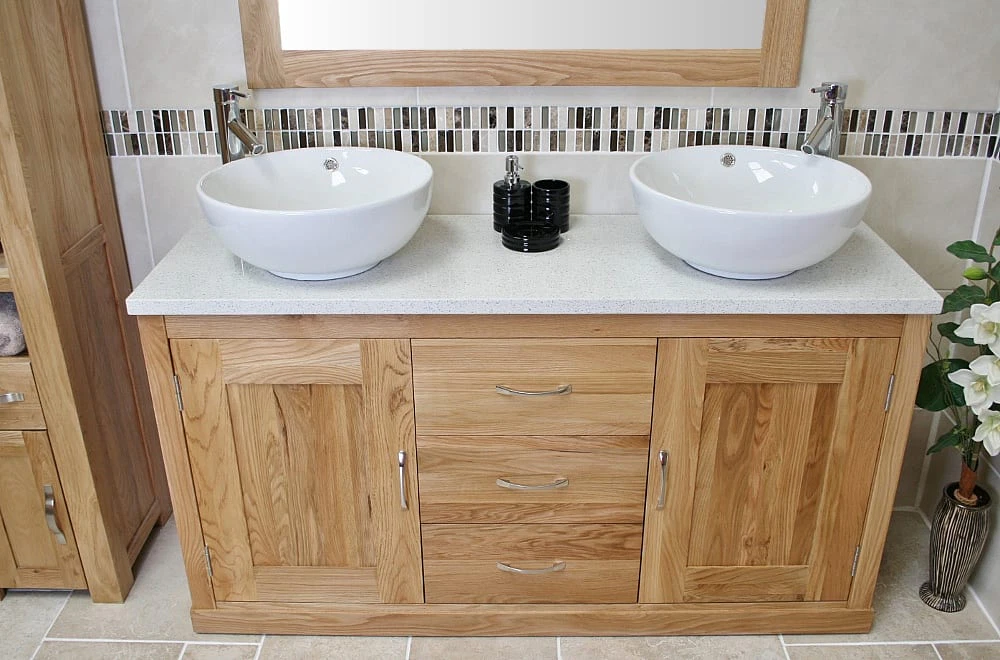 This double solid oak two cupboard (with adjustable shelves) three drawer vanity unit comes complete with two stylish round ceramic bowl sets and white quartz pre-drilled work top and is fully assembled and ready to install, this complete bathroom vanity unit has an RRP of £999.99.