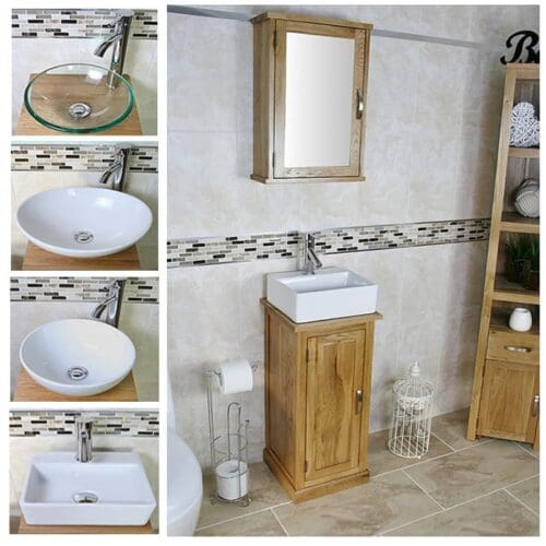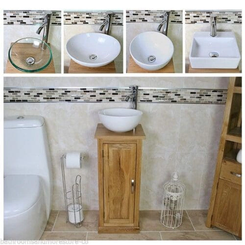 Slimline Bathroom Cabinet Vanity Unit | Solid Oak Furniture | Ceramic Sink Tap Plug 308CBC