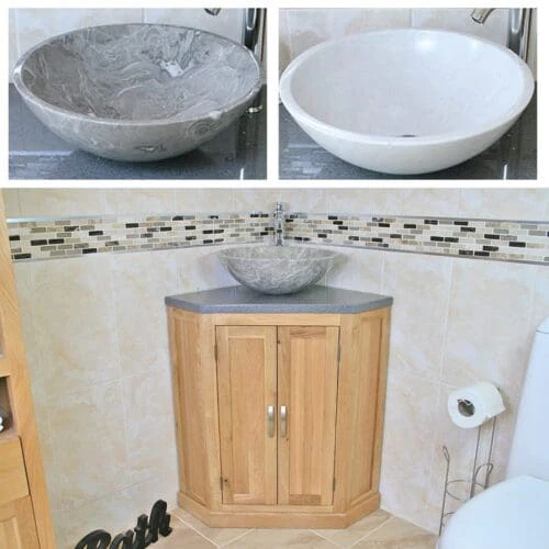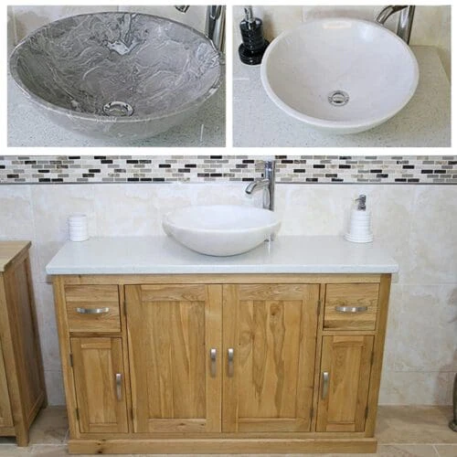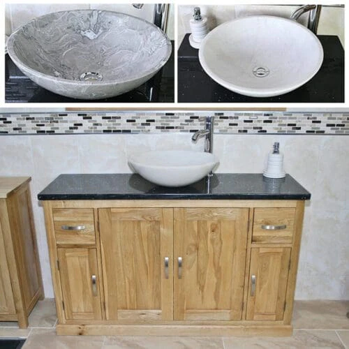 Single stone topped vanities with a choice of cream, white or black marble, white or black quartz and travertine tops with matching stone bowl or a choice of ceramic bowl.
