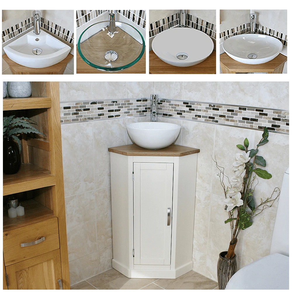 Becoming one of our more popular small vanity units, this painted oak top corner vanity comes with your choice of stylish ceramic or glass basin with optional chromed mixer tap. The perfectly sized and shaped vanity unit for small, corner or cloakroom bathrooms.