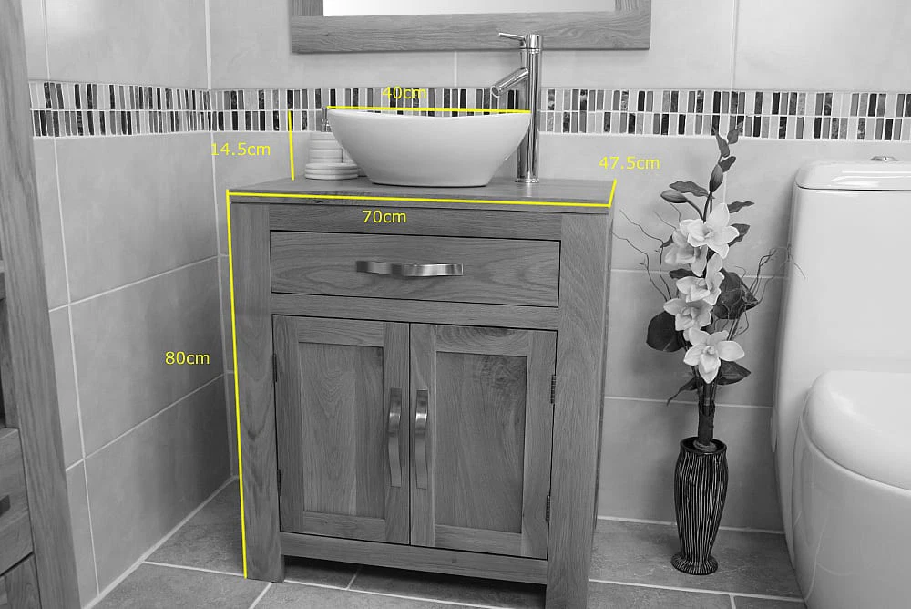 - The overall dimensions of the bathroom cabinet without the bowl are: H80cm x D47.5cm x W70cm.
