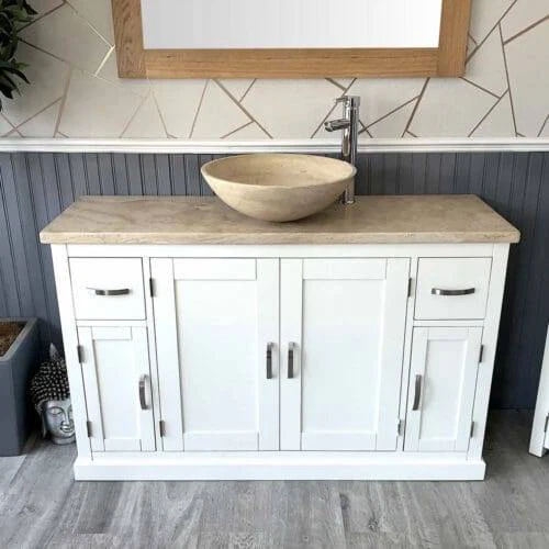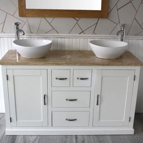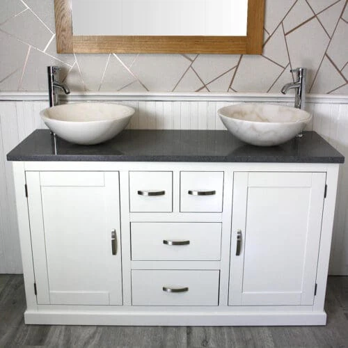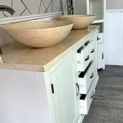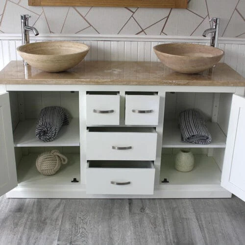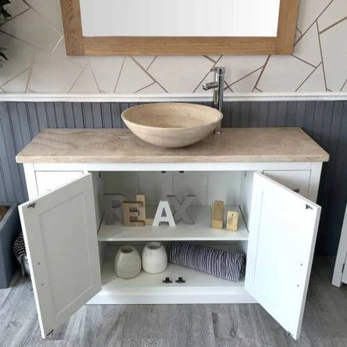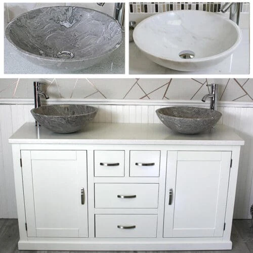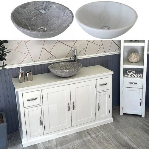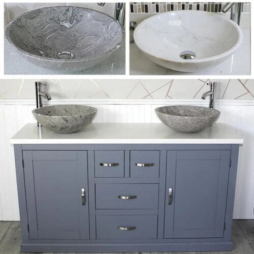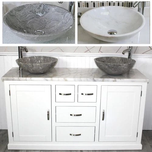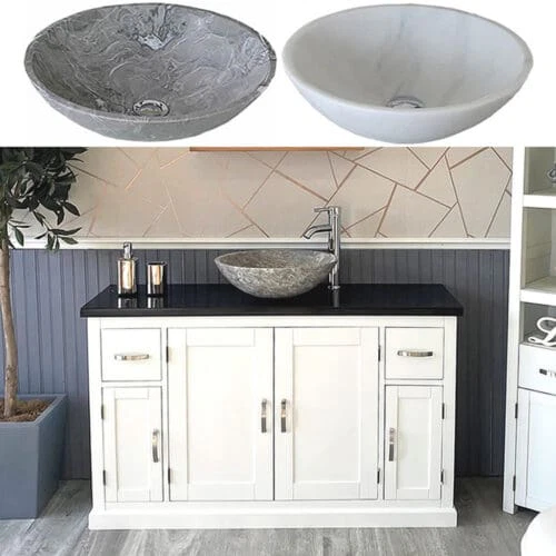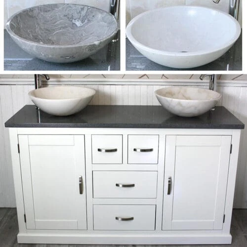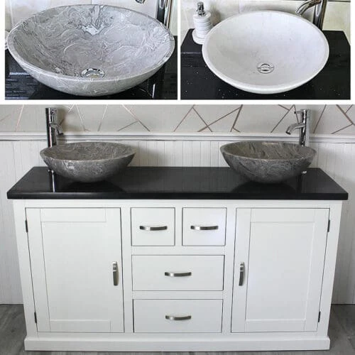 Painted stone topped range of vanities, available with a choice of white or cream marble, black, white or grey quartz and travertine tops, with stunning matching stone bowl or a choice of ceramic bowl.