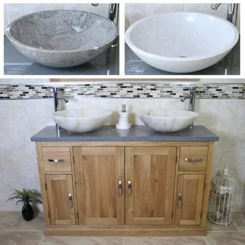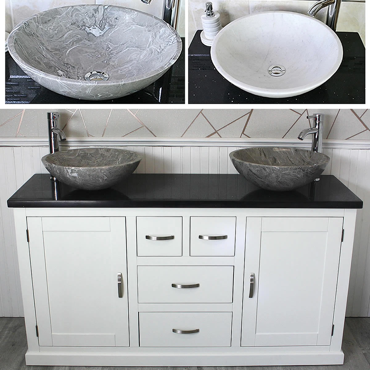 - Two beautiful heavy marble bowls of choice, see the dimensions of each basin below: