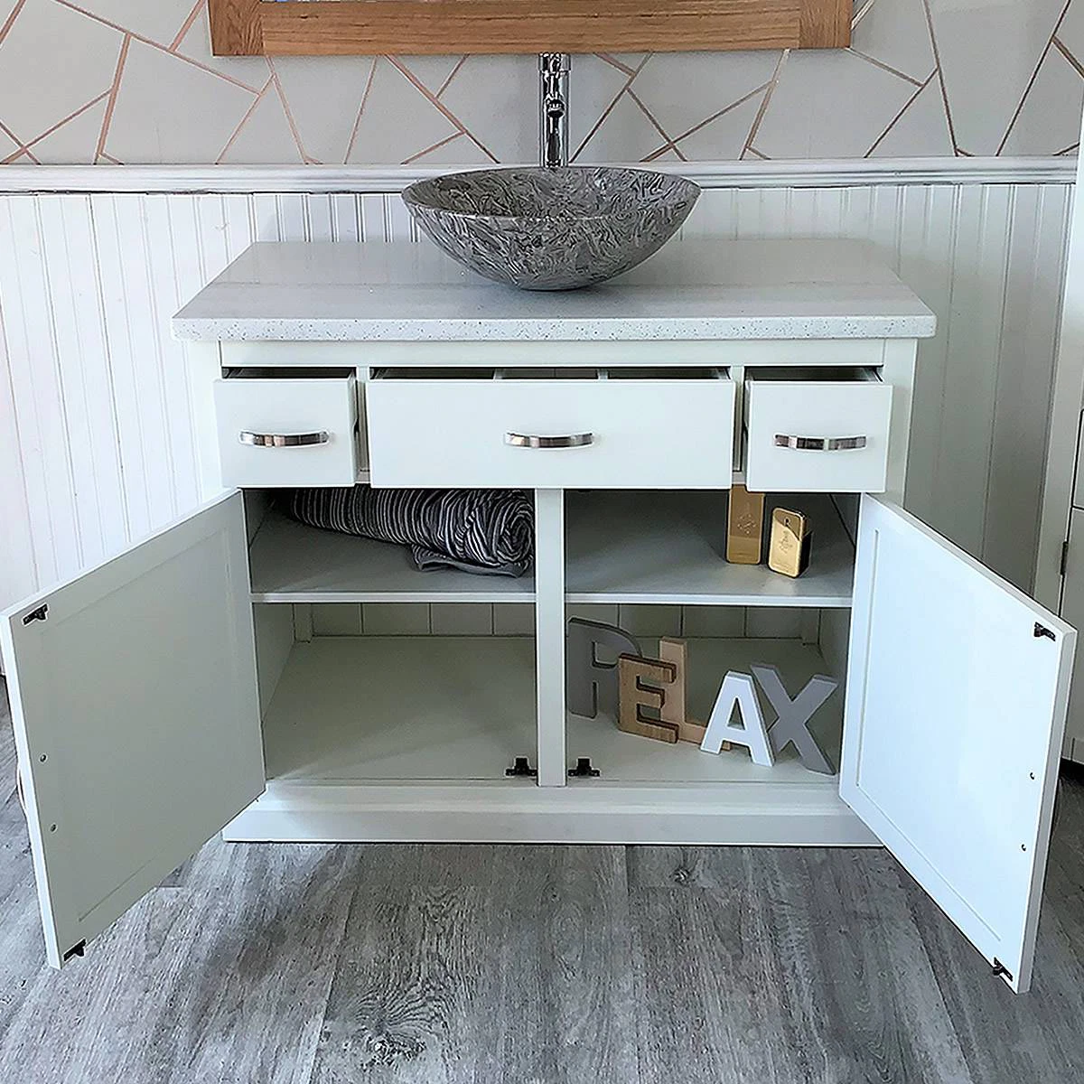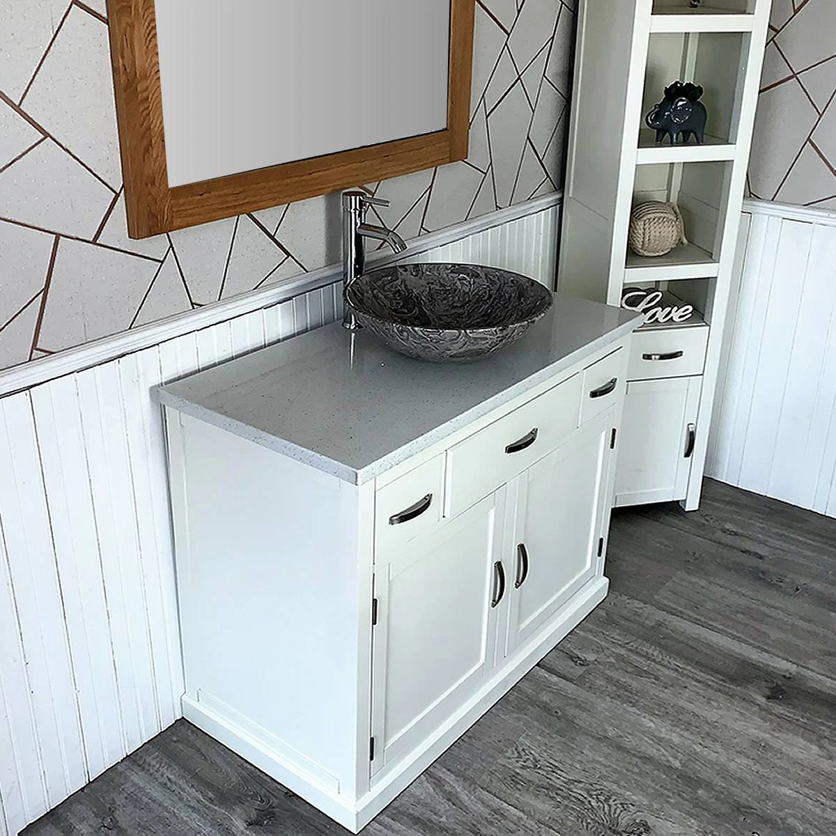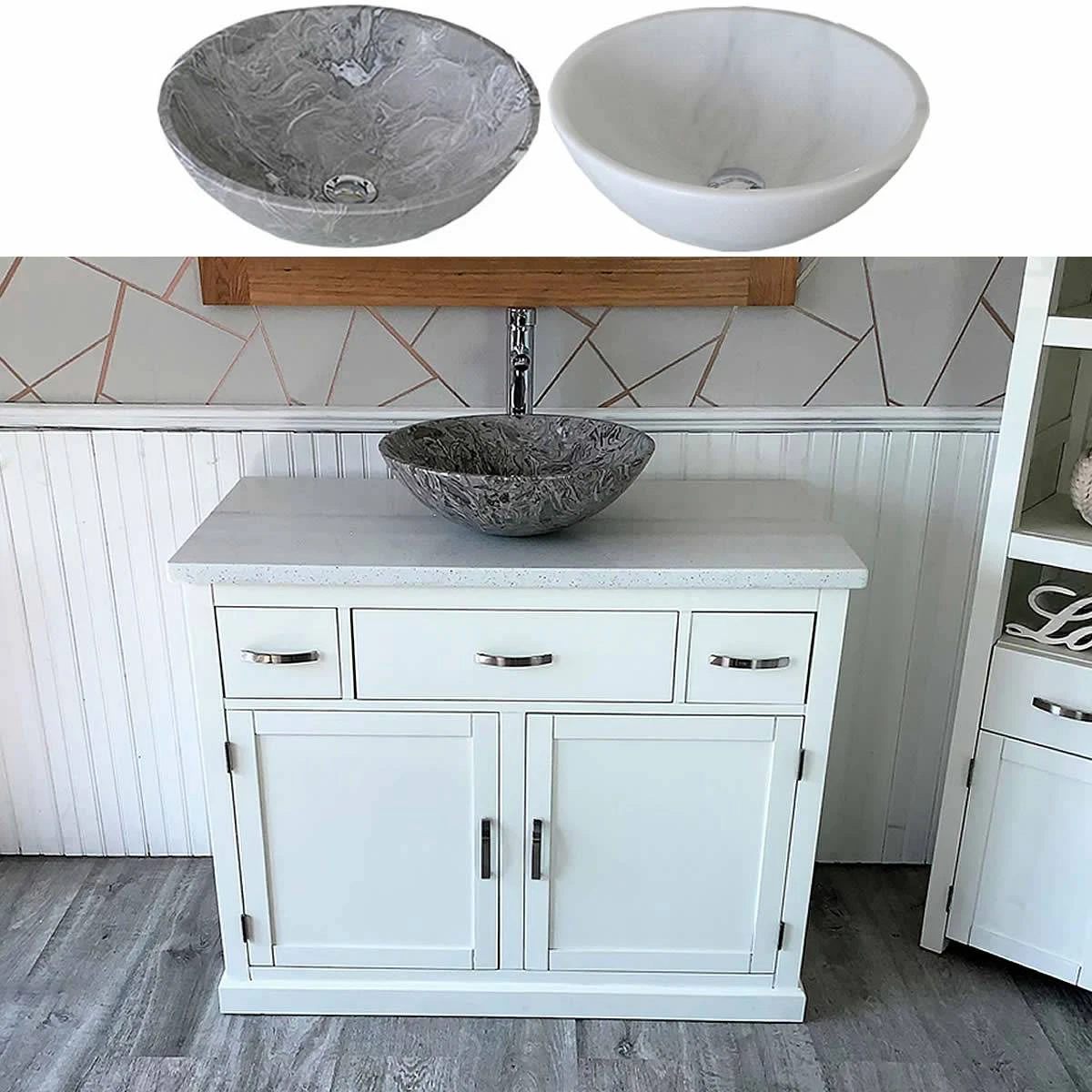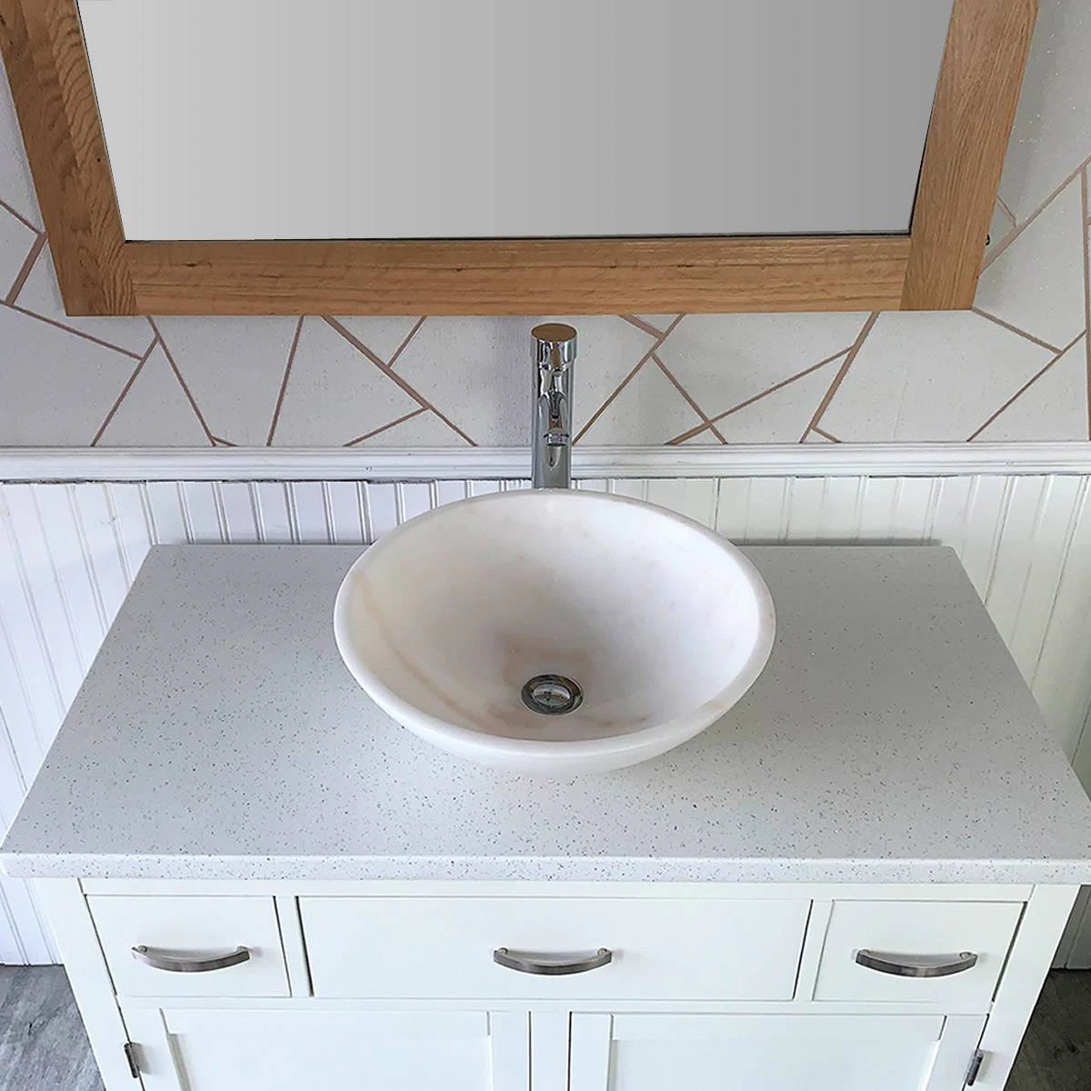 - A stunning pre drilled white quartz top.