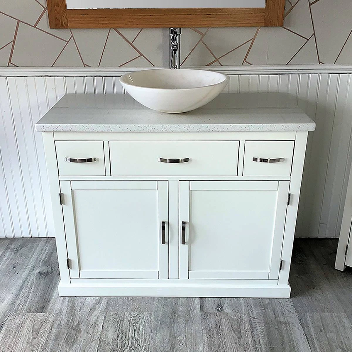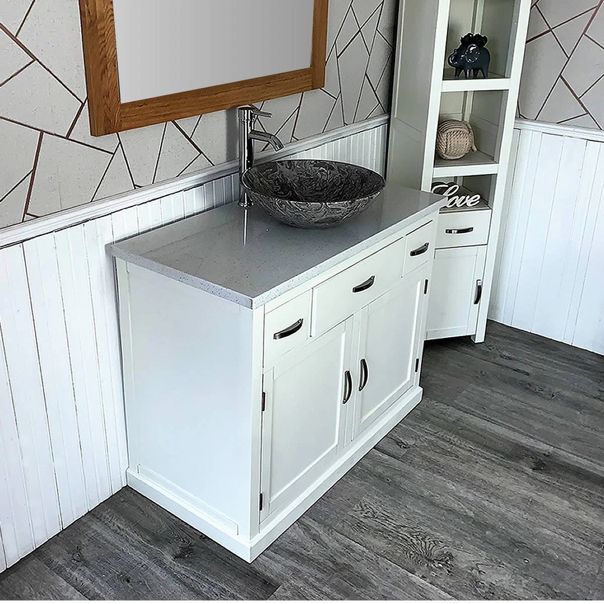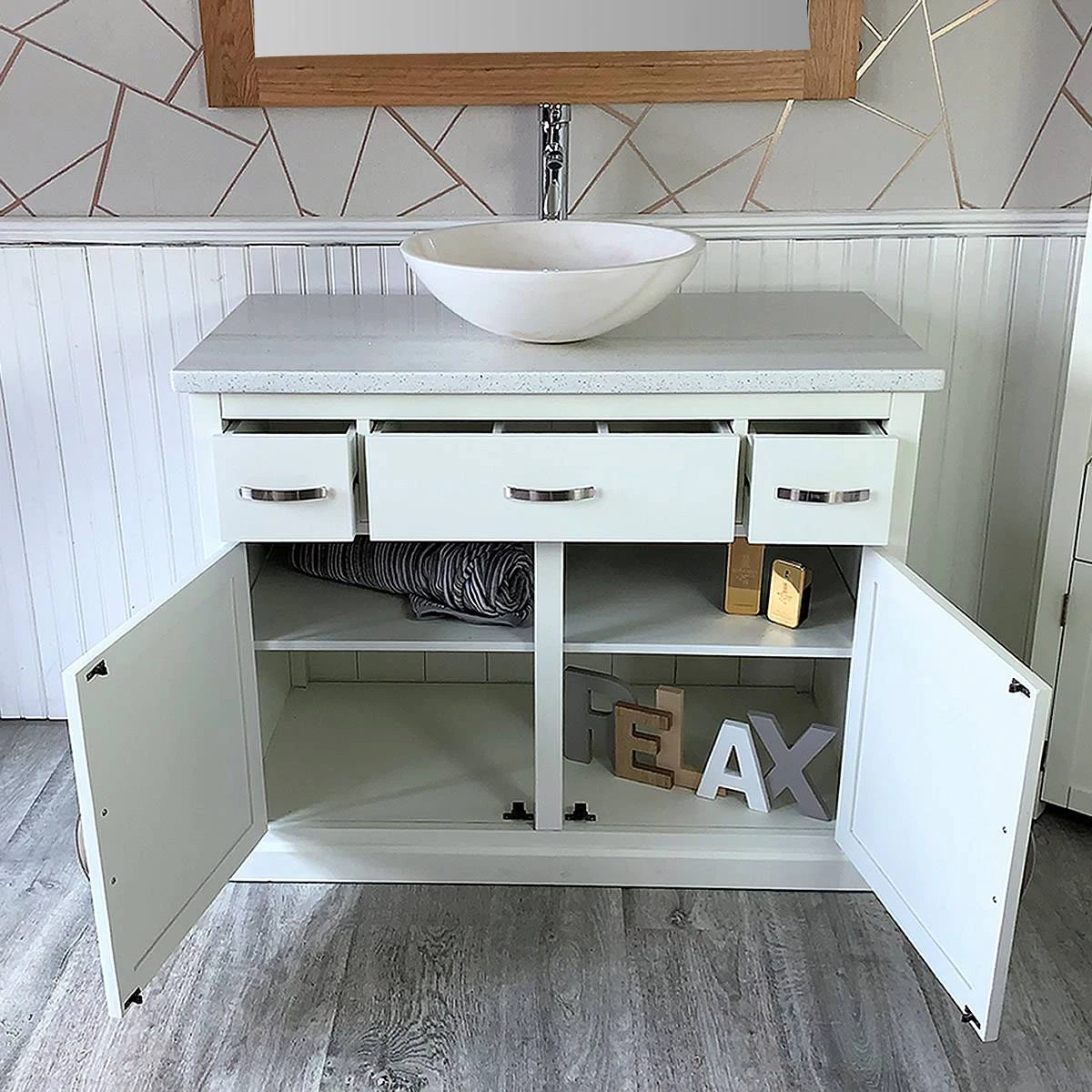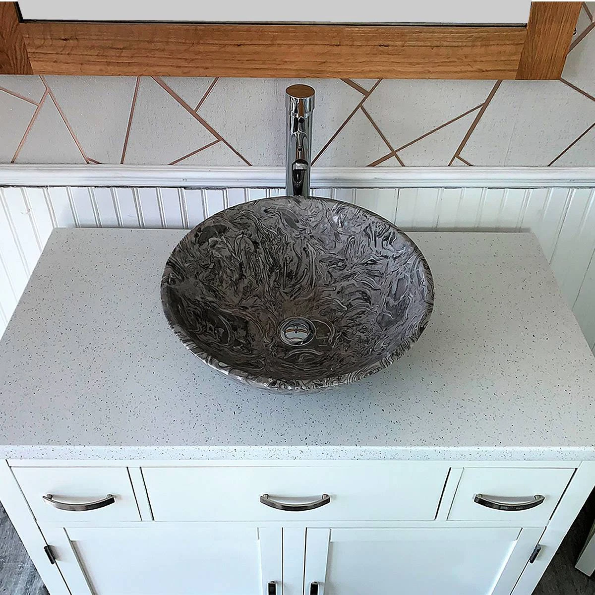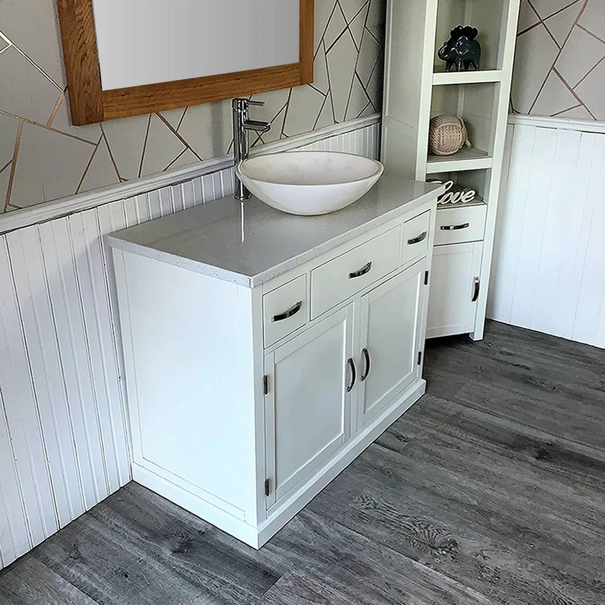 - A stunning pre drilled white quartz top.