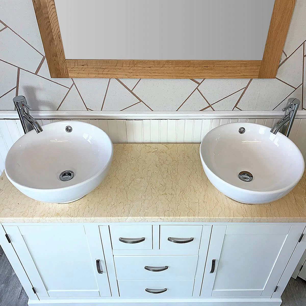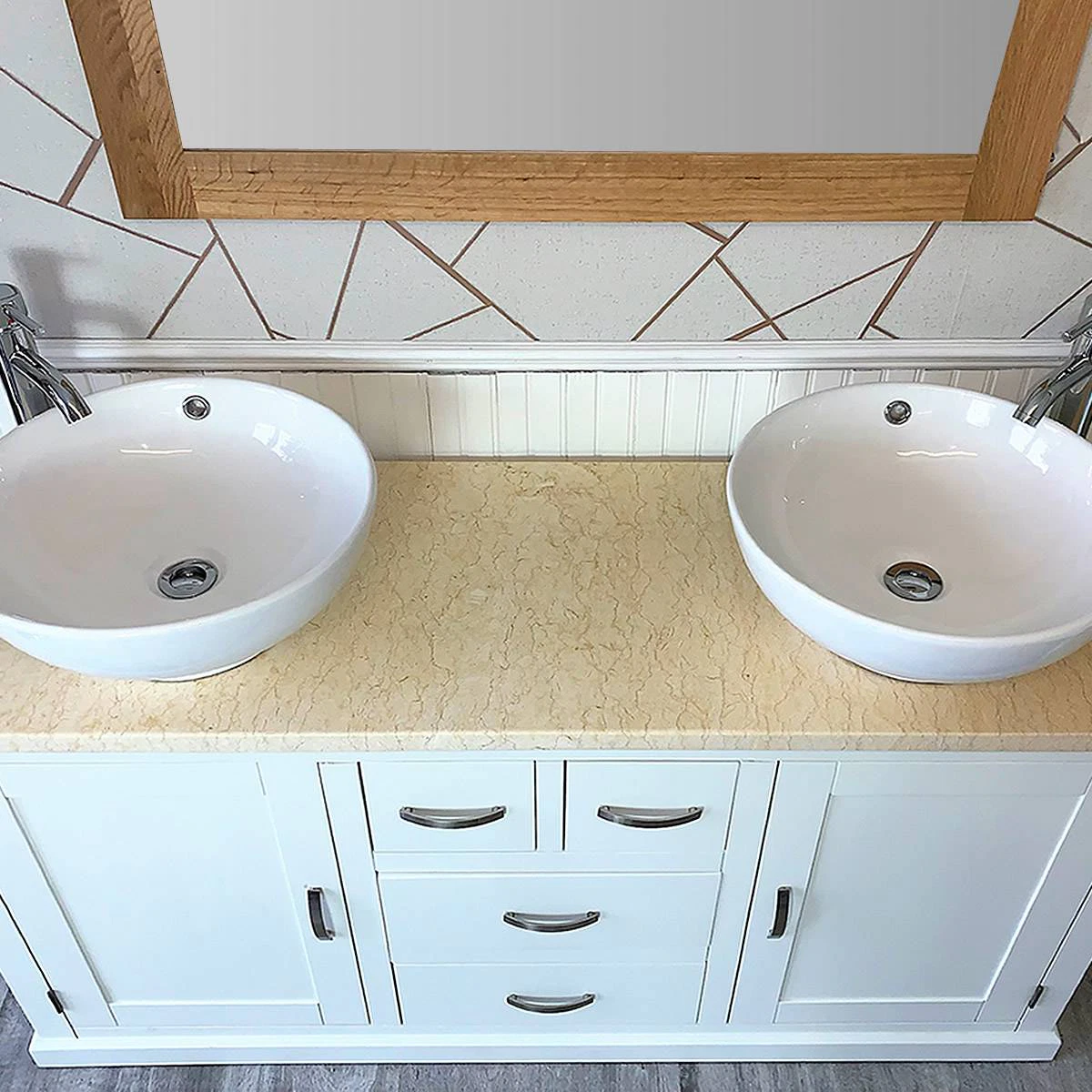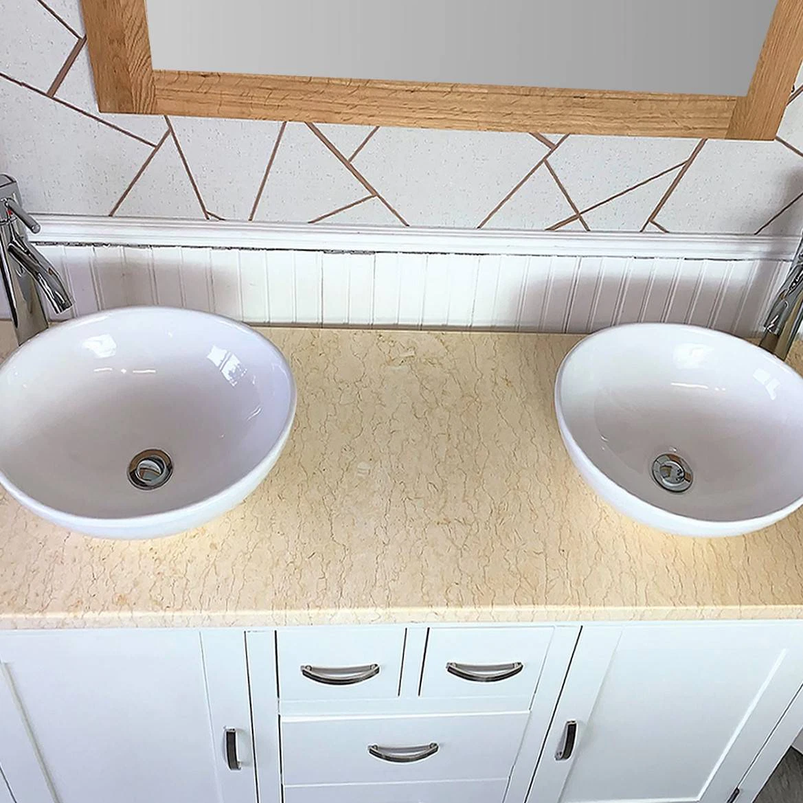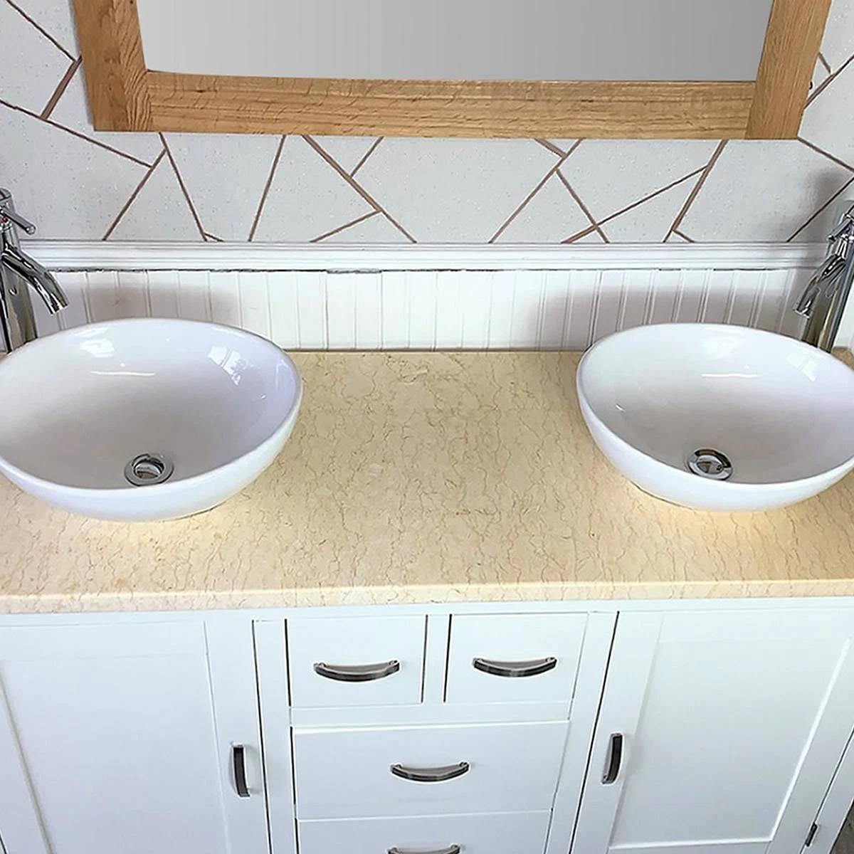 - One stunning double pre-drilled cream marble work top.