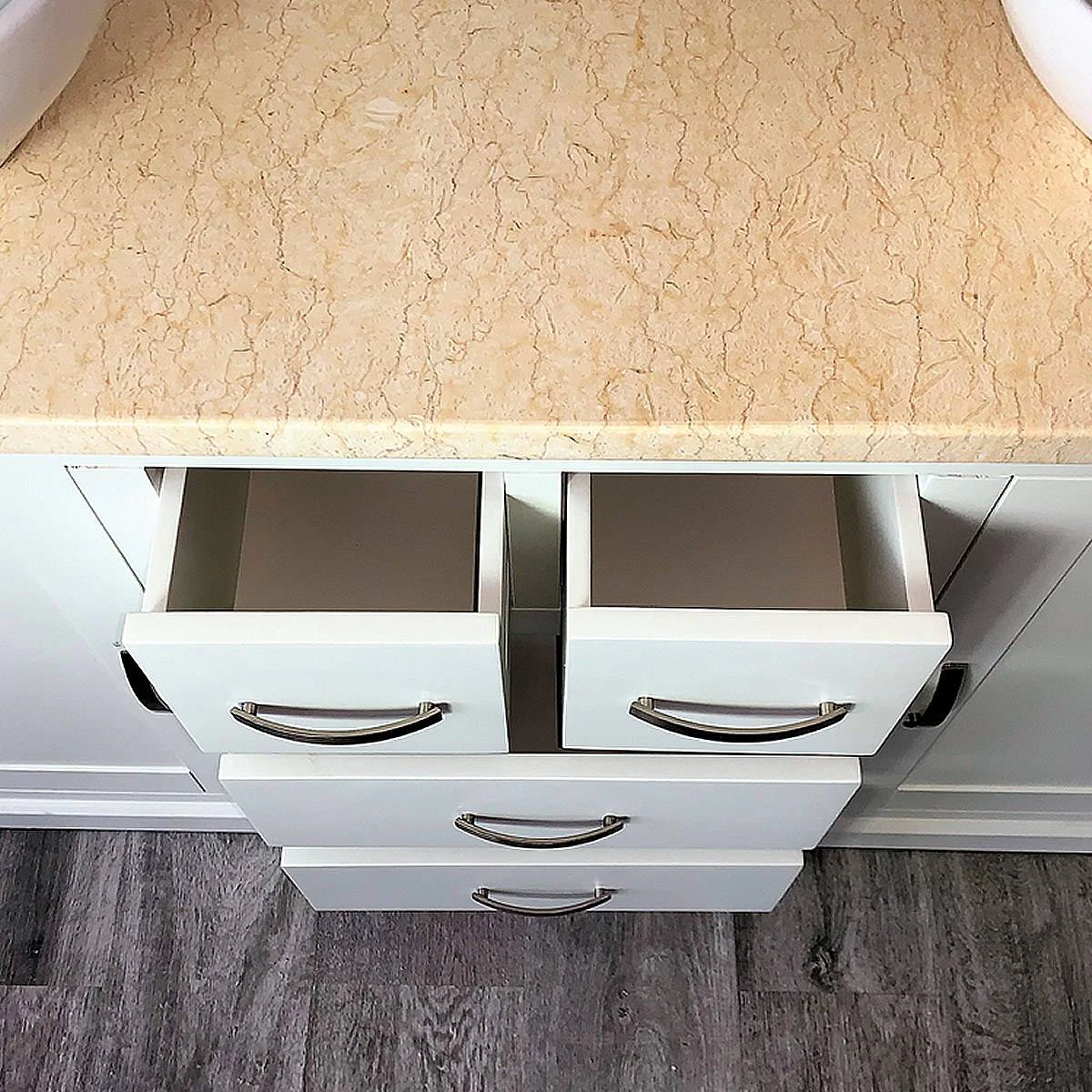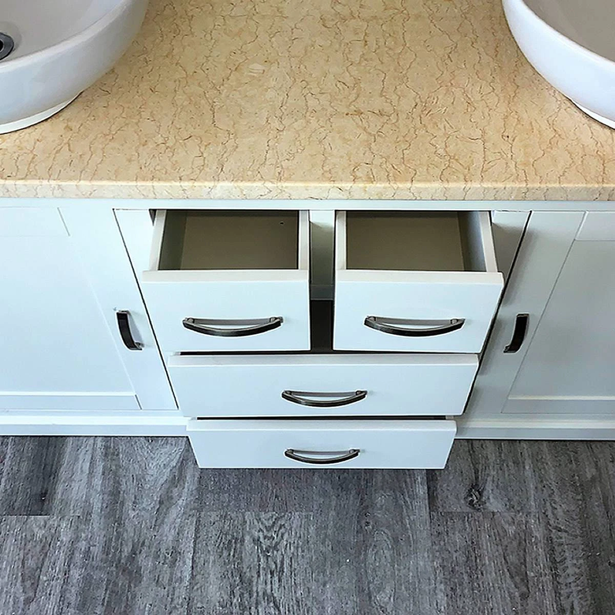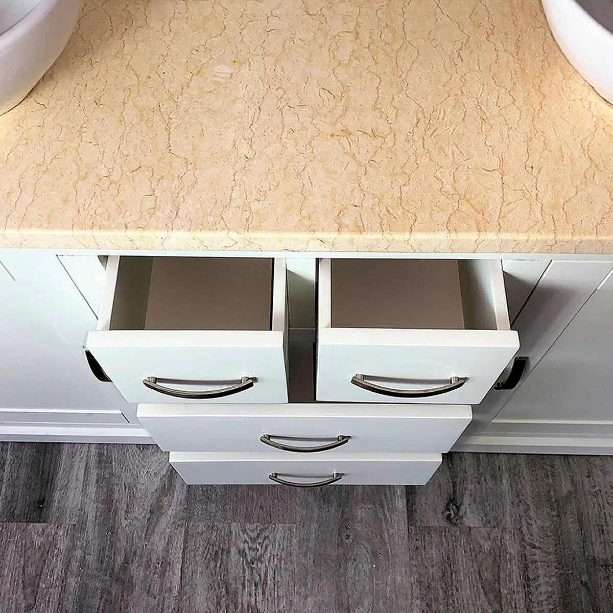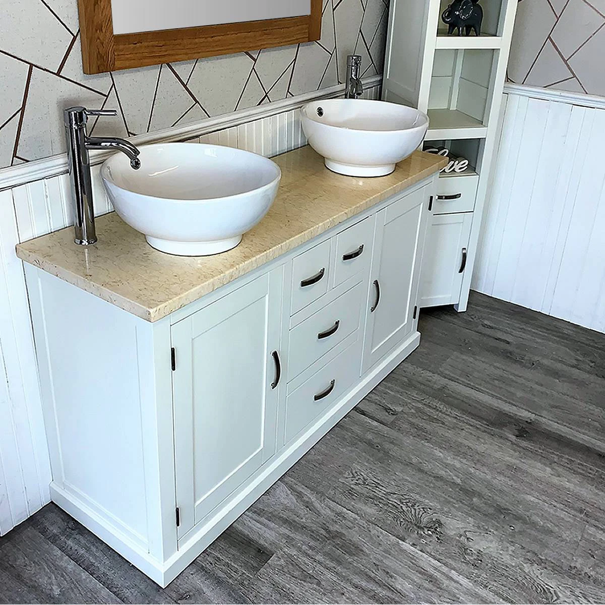 - One stunning double pre-drilled cream marble work top.
