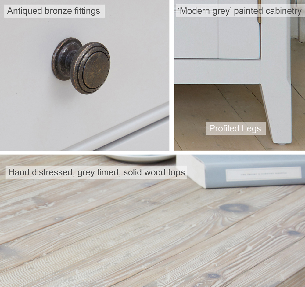 The key feature to this collection is the exquisite hand-distressing on the grey limed tops, which is carried out by skilled craftsmen to create the unique eye-catching appearance that makes this collection so distinctive