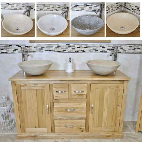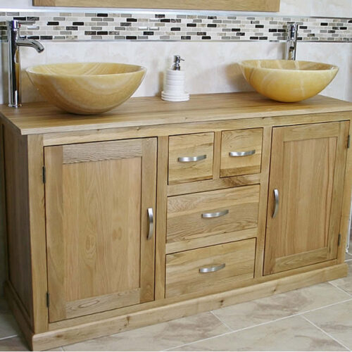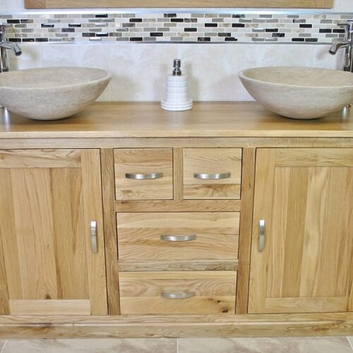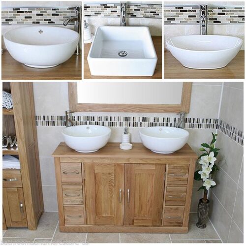 These elegant double units feature ceramic sinks atop beautifully finished oak frames. Offering generous storage and timeless appeal, they’re ideal for master bathrooms needing both style and function.