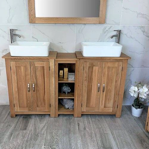 Slimline Bathroom Cabinet Vanity Unit | Solid Oak Furniture | Ceramic Sink Tap Plug 308CBC